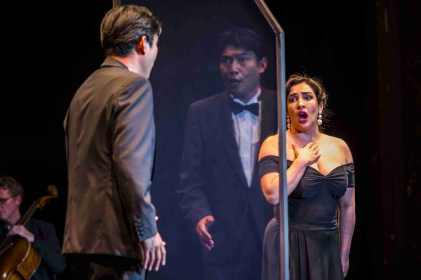 Der war wie bereits zur ersten Opernpremiere am 28. August mit Humor gewürzt, einer guten Ingredienz gegen Corona-Depression. Sara Wortmann bewies mit „Send in the Clowns“ von Steven Sondheim, daß sie auch eine talentierte Musical-Sängerin ist. Dazu rollten die Solistinnen und Solisten mit roten Clownsnasen und passenden Hütchen die unvermeidlichen Trennwände aus Plexiglas auf die Bühne. „Champagner!“ hallte es dann mit Strauss´ „Fledermaus“ durch den Saal und die Sopranistin Evmorfia Metaxaki ließ es, wie nicht anders von ihr erwartet, auch stimmlich als Prinz Orlofsky knallen, accompagniert von Nataliya Bogdanova (Sopran) als Adele und Yoonki Baek (Tenor) als Eisenstein. Anschließend gab der Bariton Johan Hyunbong Choi einen entschlossenen, zupackenden Escamillo aus Bizets „Carmen“, gefolgt vom Ochs-Monolog aus Strauss´ „Rosenkavalier“. Rúni Brattabergs Baß geht in seinen fülligen, schweren Tiefen schon als profundo durch. In Jeletzkis Arie aus Tschaikowskys „Pique Dame“ zeigte der Bariton Gerard Quinn, daß er auch das russische Fach beherrscht, wenngleich der große weiche Bogen fehlte. Die Sopranistin María Fernanda Castillo als Mimi und Yoonki Baek als Rodolfo aus Puccinis „La Bohème“ spielten souverän mit der Corona-Trennscheibe wie ein Paar, das bei einer Besuchsstunde im Gefängnis die direkte Berührung meiden muß und das kalte Glas mit ihrer Liebe durchdringt. Wiederum Puccini gab es mit Evmorfia Metaxaki als Lauretta aus „Gianni Schicchi“, deren berühmte Arie sie mit Hingabe sang. Leidenschaftlich war auch Yoonki Baeks Cavaradossi aus „Tosca“, mit dem der Puccini-Reigen beschlossen wurde.