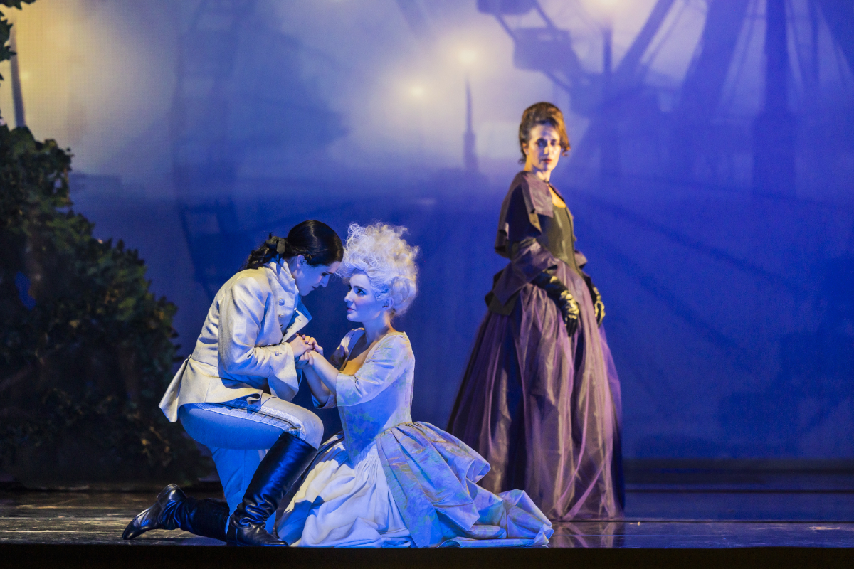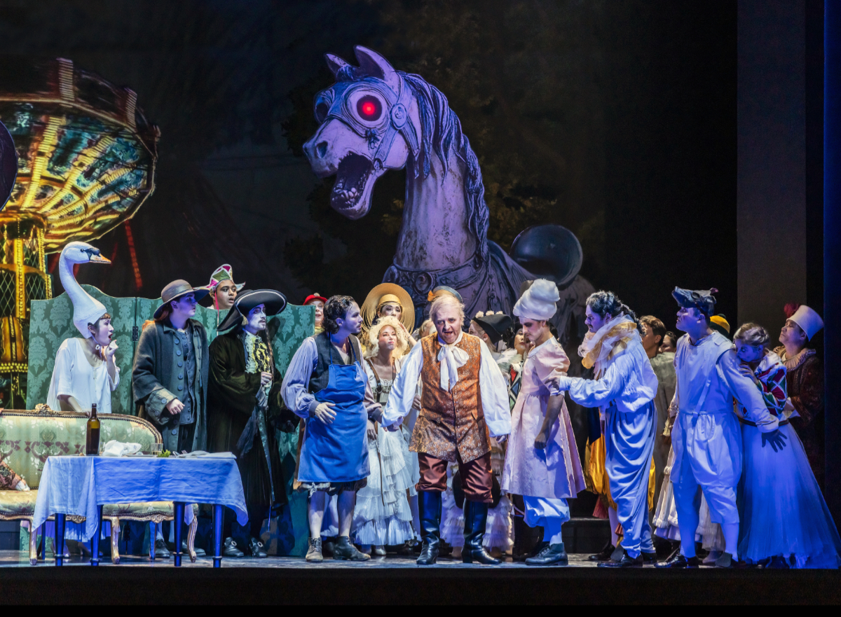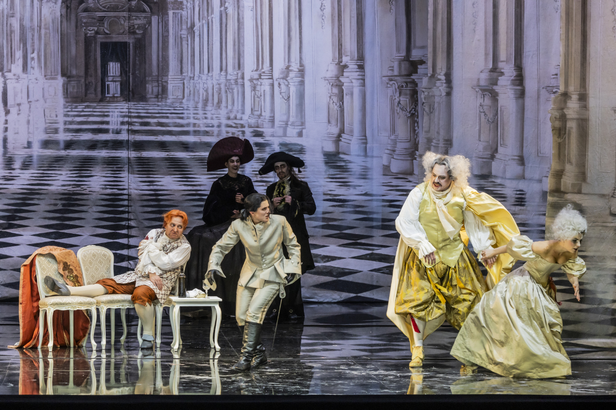 Aufrichtig gestanden: Dieser Rosenkavalier bezaubert optisch durchweg durch eine prachtvolle, handwerklich meisterhaft gemachte Bühne (Stefan Rieckhoff), detailverliebt gestaltete Kostüme (Tanja Liebermann), eine lebhafte Chorographie (Kati Heidebrecht) und eine abwechslungsreiche Lichtregie (Falk Hampel). Wie im Original spielt die Handlung vornehmlich um 1740, weist aber auch durch den Blick in eine Wiener Straße mit entsprechender Architektur und Gaslaternen in das 19. Jahrhundert und damit die große Walzerzeit. Im Prater schließlich grüßt das frühe 20. Jahrhundert durch Riesenrad-Beleuchtung und schaurige rotäugige Glühbirnen-Figuren herein. Das Spiel mit pastelligen Tönen des Spätbarock und kräftigen Koloriten, die vom Fin de siècle in die Jetztzeit führen, unterstreicht optisch den glanzvollen Reichtum der Klangfarben in der Partitur.