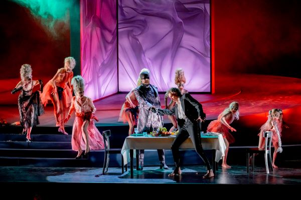 Schon vor 11 Jahren zu Beginn ihrer Intendanz stand „Don Giovanni“ auf dem Spielplan, jetzt in ihrer letzten Saison hat Generalintendant Karen Stone die Regie in der Neuinszenierung der „Oper aller Opern“ (E. T. A. Hoffmann) selbst übernommen. Mit ihrem langjährigen Ausstatter Ulrich Schulz erreichte sie durch zwei sich gegeneinander drehende Spielflächen mit leicht veränderbaren, in abstrakten Grautönen gehaltenen Stellwänden, dass die vielen Szenenwechsel fast wie von selbst passierten. Um die jeweilige Situation zu kennzeichnen, half eine intelligente, jeweils stimmungsgerechte Lichtregie. Durchaus charakterisierend waren die Kostüme gestaltet: Die „einfachen“ Leute waren in helle Anzüge und weiße Unterkleider gesteckt, während die Adligen meist ein festliches Outfit kleidete. Dabei gab es schwache Andeutungen an die Entstehungszeit der Oper, also das Rokoko, aber vor allem Anleihen bei der exzentrischen Ästhetik der Designerin Vivienne Westwood, was sich u.a. an den abenteuerlichen Hochfrisuren bei Donna Elvira und der Feiergesellschaft des Finales im 1. Akt zeigte. Dass Leporello auf seinem T-Shirt die Aufschrift „SERVO“ trug, war überflüssig; unverständlich waren in der Szene, wenn dieser seine Giovanni-Verkleidung aufgeben muss, sieben verschleierte Frauengestalten mit Totenköpfen. Trotz dieser kleineren Ungereimtheiten war wieder einmal beeindruckend, mit welcher spürbaren Spielfreude das gesamte Ensemble sicher und glaubhaft durch die Anleitung der erfahrenen Regisseurin agierte. Anders als anderswo wurde so gut wie nichts gekürzt; Ottavio durfte seine beiden Arien „Dalla sua pace“ und „Il mio tesoro“ und Elvira „Mi tradi quell’alma ingrata“ singen. Manche Kürzungen der überlangen Rezitative hätten einem stringenteren Ablauf der Handlung allerdings gut getan.