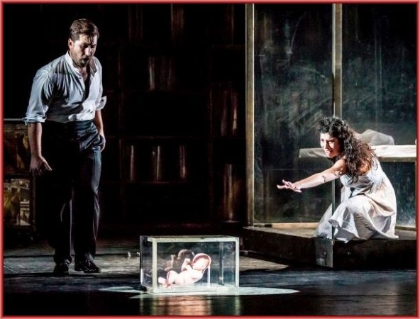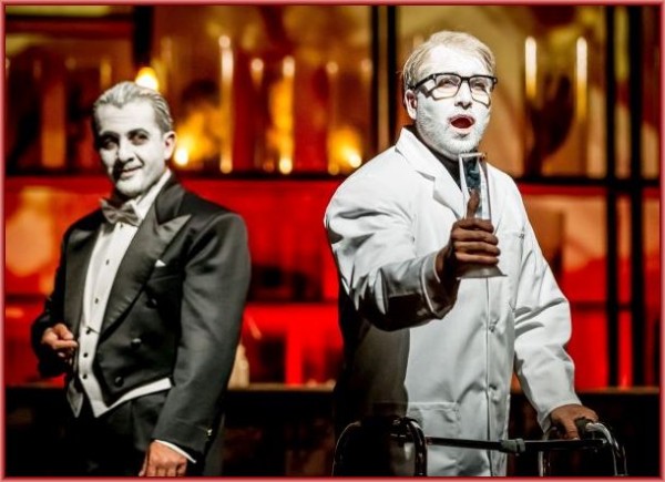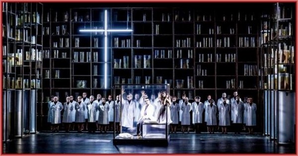 Aber nun zunächst zur Inszenierung: Zum Vorspiel sah man auf einen Zwischenvorhang, auf dem sich naturwissenschaftliche Formeln und das Goethe-Zitat „Daß ich erkenne, was die Welt im Innersten zusammenhält“ aufbauten, offenbar das Motto für das Konzept des Bühnenbildes (Niki Turner), ein Labor, das nach hinten und zu den Seiten mit hohen Regalen voller Behälter mit chloroformierten Tier-Mutationen und menschlichen Körperteilen begrenzt war. In den folgenden Szenen blieben die Begrenzungen mit den Regalen bestehen, nun allerdings ohne rechten Bezug zu den Handlungsorten, die jeweils durch wenige Requisiten angedeutet wurden. Die detailverliebten, knallbunten Kostüme von Falk Bauer trugen mit dekorativen Video-Einspielungen zum farbigen Gesamteindruck bei. So war beispielsweise die Kirmes-Szene mit dem Abschied der Soldaten und dem Tanz ums goldene Kalb durch die Verkleidung der Choristen als Transvestiten, als männliche Playboy-Häschen oder als eine Art freizügige Funkenmariechen in der wirren Choreografie von David Williams so skurril und bizarr, dass sie zu dem ernsten Gebet Valentins einen starken Kontrast bildete. Sehr viel eindrücklicher war die Rückkehr der Soldaten, als diese – durch die Kriegserlebnisse sichtlich traumatisiert – sich zu dem übermäßig pathetischen Soldatenchor aufrafften.