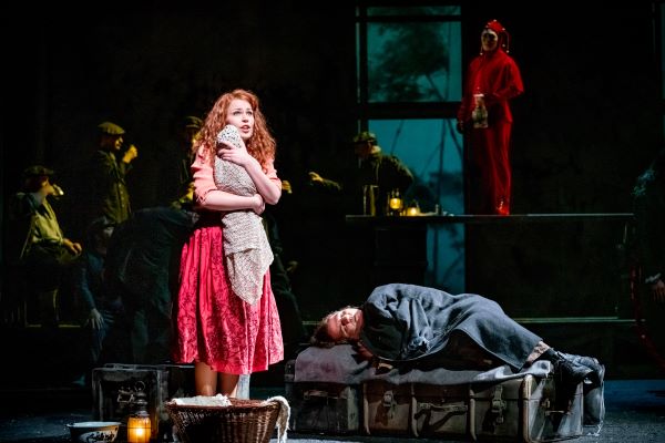 Eugen Engels einzige Oper enthält mit lebhaften Chorszenen, zarten Klängen des Liebespaars und dramatischen Steigerungen so ziemlich alles, was zu großer Oper gehört. Im ersten Akt wirken die Chöre mit einem derben Walzer noch reichlich grob geschnitzt. Das verdichtet sich in Arendsee, wenn im zweiten Akt in der turbeligen Wirtshaus-Szene der Wirt (mit prägnantem Bass Frank Heinrich) Lokalkolorit herstellt, indem er in dem dort üblichen Dialekt über die Einwohner der Nachbarorte Magdeburg, Tangermünde, Salzwedel und Stendal herzieht. Noch stärker wird es in der Sterbeszene mit Gretes innigem Wiegenlied, dem von ihr als Engel aus dem Off gesungenen Marienlied aus dem Mysterienspiel der Komödianten zum Sterben von Valtin und dem Segen der Domina. Besonders im Finale wird alles ineinander verschränkt, die Tonmalerei des sich ausbreitenden Feuers, das Entsetzen des Volks und der ernste Spruch von Gretes Vater über die Ausübung von Gerechtigkeit. Die Stärken der im Ganzen eingängigen Musik liegen damit deutlich in den lyrischen, liedhaften Szenen; dagegen ist die Illustrierung der Dramatik nach meinem Geschmack allzu plakativ und aufdringlich, was wohl auch an der starken Instrumentierung liegen mag, mit der die Akteure auf der Bühne so manches Mal ihre Probleme hatten. Hier hätte Anna Skryleva die sehr präsente Magdeburgische Philharmonie etwas dämpfen müssen, wenn auch der spätromantische Farbenreichtum der vielschichtigen Partitur durchaus angemessen zur Geltung kam.