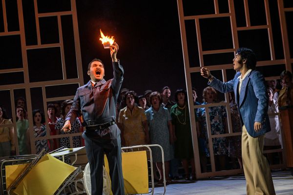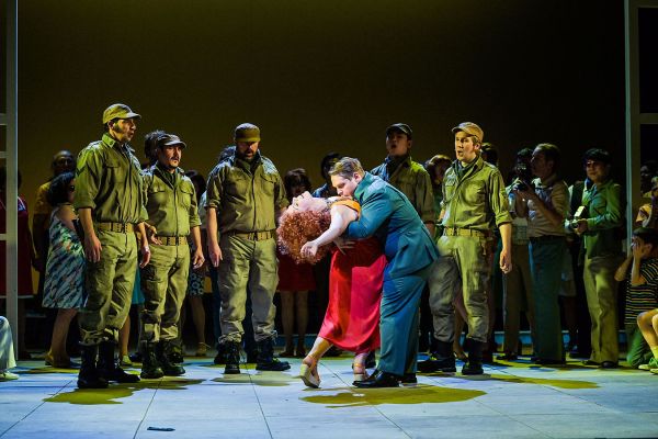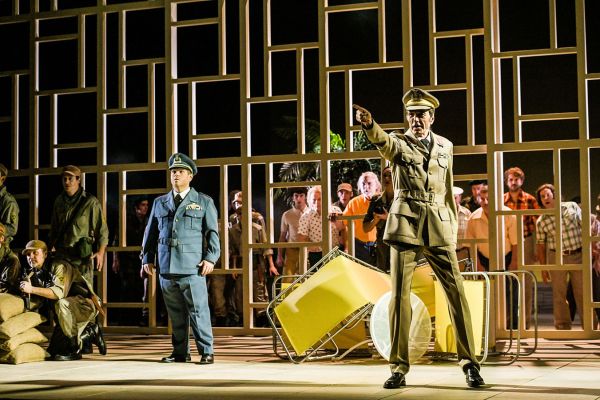 Dazu der fragilen Situation angepasst das wunderbare Bühnenbild von Yannis Thavoris.Selten erlebt man die Beziehung von Otello und Desdemona in mitten des Kampfgeschehens so ausweglos und zugleich berührend, wie in der Inszenierung der Olivia Fuchs. Der australische Gastsänger Aldo di Toro meistert die Titelrolle mit einem warmen dunkel gefärbten Tenor, der durchaus auch mühelos strahlende dramatische Ausbrüche ermöglicht. Dabei spart er auch nicht in den Schluss-Szenen am schluchzenden Pathos.