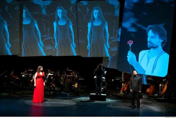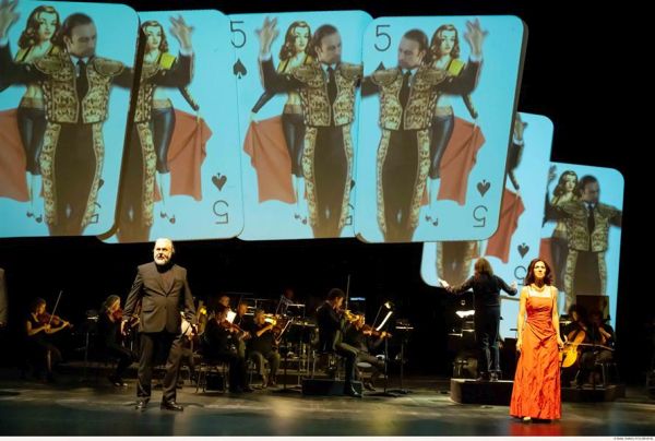 Nachdem bei meinem Besuch in Krefeld Anfang Juni 2021 leider die Videoeinspielungen auf Grund von technischen Problemen entfallen mussten, stand am Freitag, dem 08.10.2021 nun erneut die Kurzversion der Oper Carmen auf dem Programm, dieses Mal im anderen Haus des Gemeinschaftstheaters Krefeld-Mönchengladbach. Und hierbei lief nun auch auf technischer Seite alles rund, so dass man neben der wunderbaren Musik von Georges Bizet auch optisch gut unterhalten wurde. In den Videoeinspielungen von Kobie van Rensburg (Konzeption, Videoregie und Ausstattung) schlüpfen vier Mitglieder der Ballettkompanie in die Rollen von Carmen, Don José, Micaela und Escamillo und begleiten das musikalische Geschehen teilweise in bewegten Bildern, teilweise aber auch in sehr eindrucksvollen Standbildern. Projektionsflächen für diese Videoeinspielungen sind vor allem überdimensionale Spielkarten, die teilweise vom Schnürboden herabgelassen werden. Das Glück der Karten und die Frage nach dem Schicksal sind zentrale Motive der Oper, so dass diese Gestaltung sehr passend daherkommt. Erneut lässt sich feststellen, dass eine Produktion bei der Kobie von Rensburg für die Videokunst zuständig ist, jedem Opernfreund diesbezüglich blind empfohlen werden kann.