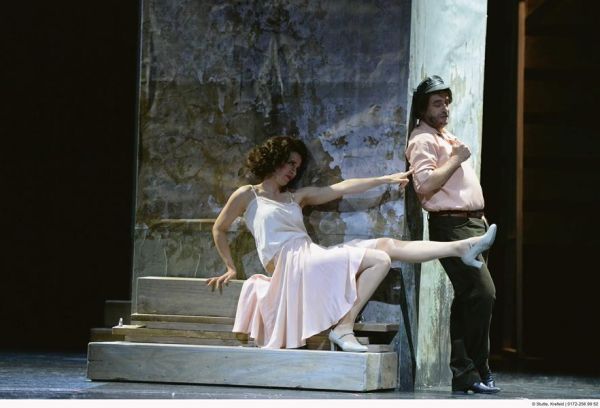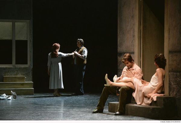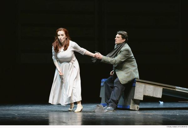 Und dann gibt es auch noch Izabela Mazula. Von der polnischen Sopranistin sind viele ihrer seit 2012 an diesem Haus verkörperten Partien noch in bester Erinnerung. Die Katja besitzt eine nochmals gesteigerte Intensität des Singens, wobei die sichere, leuchtende Höhe besonders nachhaltig beeindruckt. Fast möchte man für diese Wirkung Brünnhildes „Heil dir, Sonne, Heil dir, Licht“ zitieren. Izabela Matulas Gesang wirkt freilich nie selbstzweckhaft, sondern macht auf beklemmende, erschütternde Weise das Schicksal einer Frau erlebbar, welche vergeblich Lebensglück und echte Liebe sucht, doch zuletzt keinen anderen Ausweg sieht als den Freitod. „Wovon wir träumen, ist Teil der Realität, in der wir leben“, signalisiert zu Beginn eine Projektion auf dem Vorhang.