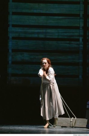 Das Haus der Kaufmannswitwe Kabanicha wird mal mit seiner Außenfront, mal mit seinen Interieurs gezeigt. Auf der Drehbühne zerteilen sich die Aufbauten immer wieder, gestalten sich zu fast schon irrealen Räumen. Auch die handelnden Personen sind nicht immer realistisch greifbar. Der Chor (Einstudierung: Maria Benyumova) agiert beispielsweise als fast schon alptraumhaftes Anklagekollektiv, Kuligin (ganz hervorragend: Shinyoubng Yeo aus dem Opernstudio) macht, obwohl eine Nebenfigur, mit fast apokalyptischem Gebaren als Mahnfigur immer wieder auf sich aufmerksam, legt zuletzt der an ihrer „Untreue“ fast erstickenden Katja ein Seil um den Hals. Sie wird den Tod in den Wassern der Wolga suchen, welche schon zuvor immer wieder als dezent bewegte Projektion erscheint. Man erlebt keinen spektakulären Tosca-Sprung in den Fluss, Katja verschwindet einfach in der Menschenmenge, welche sie zuletzt ganz verdeckt, praktisch aufsaugt. Helen Malkowkys Inszenierung weitet sich also immer wieder ins Irreale, bietet visionäre Aspekte.