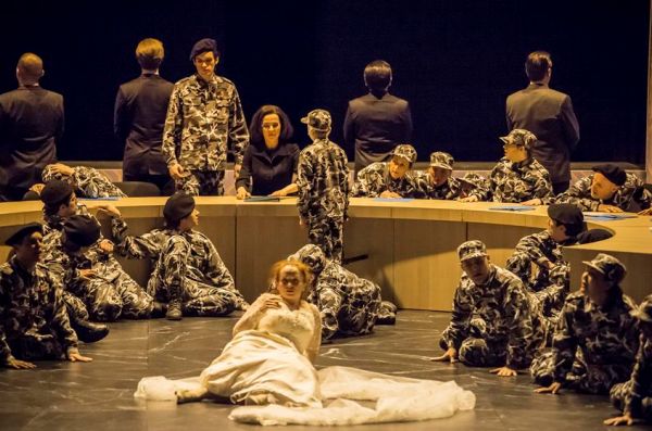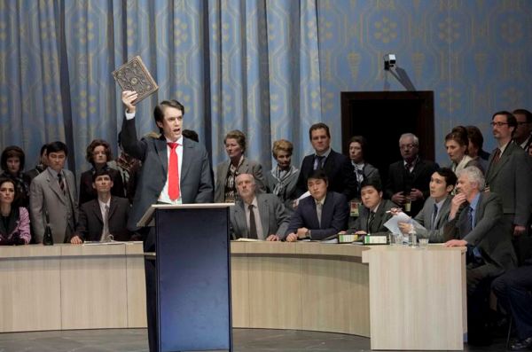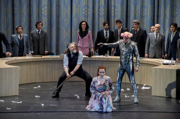Auf der Bühne selbst, die Tom Musch als modernen Konferenzraum mit einem halbkreisförmigen Tisch und angedeuteten mittelalterlichen Burgzinnen gestaltet hat, schlummert eine autokratische Männergesellschaft in modernen geschäftsmäßigen Anzügen (Kostüme: Ingeborg Bernerth), die sofort nach ihrem Erwachen ihrem unheilvollen Geschäft nachgeht und den nächsten Krieg vorbereitet.