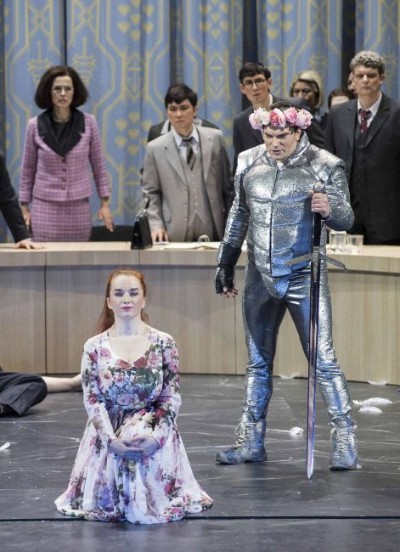 „Wunder oder fauler Zauber“? Wie geht man als Regisseur mit dem mythisch-mystischen Sujet von Wagners romantischer Oper um? Robert Lehmeyer gibt in seiner Inszenierung eine eindeutige Antwort. Im Programmheft drückt er es selbst so aus: „Die Utopie einer revolutionären, auf bedingungsloser Liebe beruhenden Gesellschaftsordnung jenseits der politisch-gesellschaftlichen Realität“ erweist sich im Verlauf (der Handlung) als „Albtraum“. Schon bei der Ouvertüre prallen zwei Welten unversöhnlich aufeinander. Da ist einmal die in einem mädchenhaften Blumenkleid gewandete Elsa mit ihrem Bruder Gottfried, dessen Haupt eine zu Elsas Kleid passende Blumenkrone schmückt. Sie guckt träumerisch und selig lächelnd in die Ferne und malt sich ihren Traumhelden aus, der im Hintergrund der Bühne mit Schwert und identischer Blumenkrone in seiner Nacktheit Elsas utopisches Bild des reinen Helden symbolisiert.