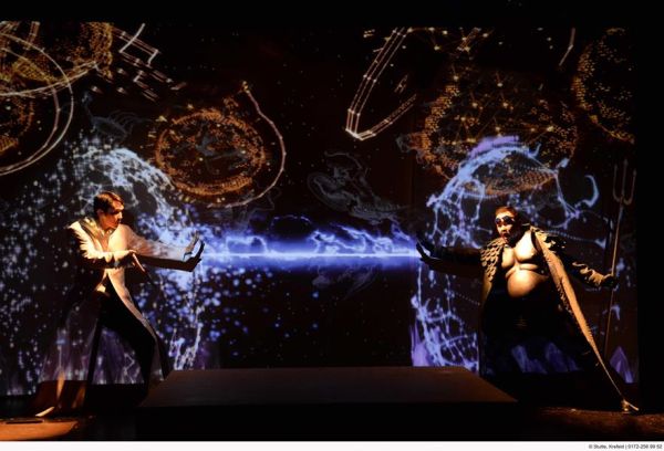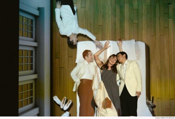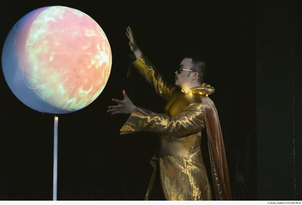 Diese Geschichte ist hübsch „crazy“ und Anlass für eine neue Spielvariante für Kobie van Rensburgs individuelle Inszenierungsästhetik. Die für ihn typische ausgiebige Nutzung der Videotechnik bekommt nicht zuletzt der kleinen Studiobühne des Mönchengladbacher Theaters gut. Auf der hinteren Projektionswand flimmert und flammt es mit immer neuen Bilderfindungen und Farborgien, teilweise gemischt mit filmischen Liveaufnahmen. Bei Rensburgs Kostümen bekommt das Auge gleichfalls viel zu sehen. Die meist sehr umgangssprachlichen Übertitel (es fällt u.a. das Wort „Niedervolt-Niete“) spielen erheiternd mit.