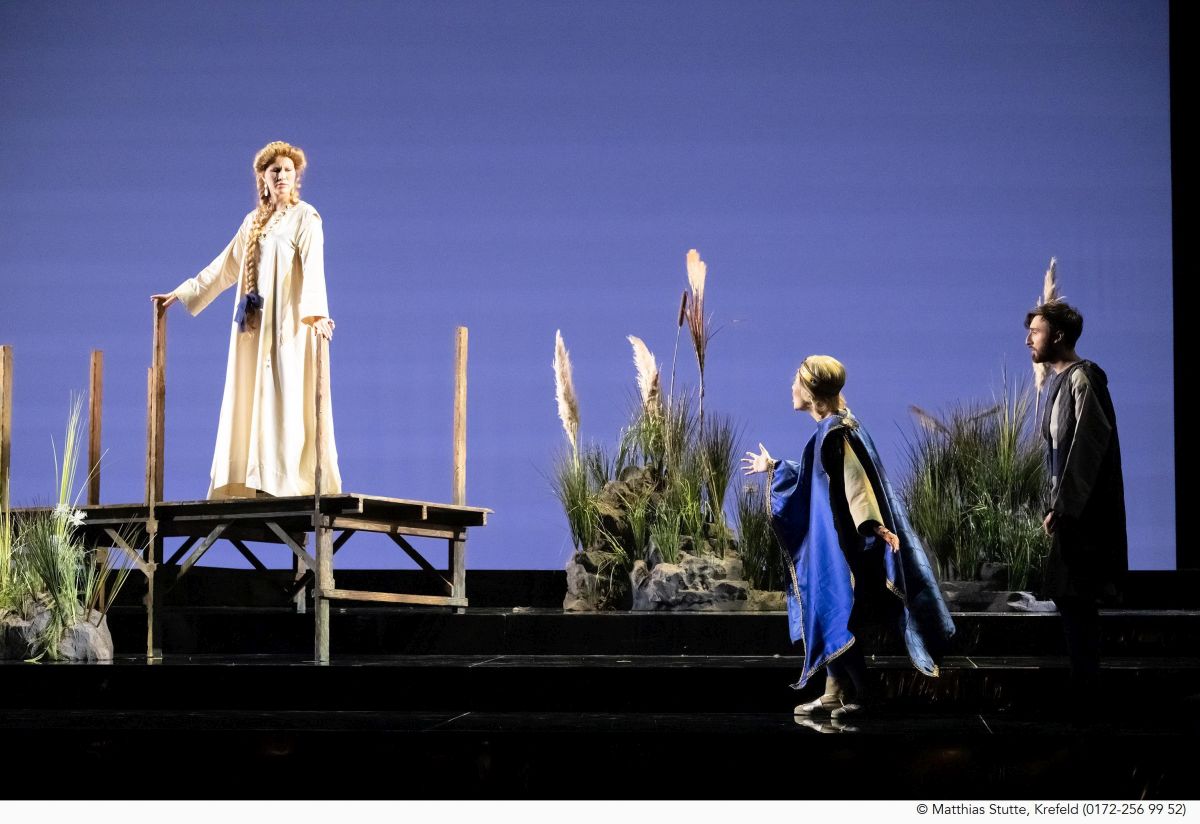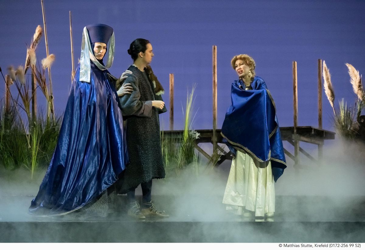 Mit vielen Anlehnungen an Opernaufführungen der damaligen Zeit trägt die Inszenierung von Emanuele Gamba ebenfalls zu diesem gelungenen Gastspiel bei. Die Sängerinnen und Sänger singen zwar oft zum Publikum gewandt, dennoch ist die Inszenierung nicht allzu statisch. Auch der gut eingesetzte Humor lockert den Abend auf. Einziges Manko sind die durchgängig gleichbleibenden Kostüme der Protagonisten, sodass die vielen Verkleidungen, die stattfinden, nie klar erkennbar sind, sondern sich lediglich aus dem Libretto ergeben. Hier fragt man sich immer wieder, welches große Potenzial in dieser Oper schlummern mag, wenn sich ein Regisseur an eine große Inszenierung wagt, die diese vielen Verkleidungen gekonnt umsetzt. Da es sich bei diesem Gastspiel allerdings um eine Aufführung des Conservatorio di Musica Benedetto Marcello handelt, die im Rahmen der musikalischen Ausbildung an diesem renommierten staatlichen Musikinstitut entstand, ist dieser Aspekt in diesem Fall leicht zu verschmerzen. Das meist schlichte, dennoch aber durchaus stimmungsvolle Bühnenbild (Ausstattung: Matteo Corsi) weiß zu gefallen und sorgt mit Bühnennebel auf dem See und wechselnden farblichen Hintergründen für ausreichend Abwechslung.