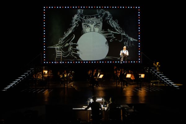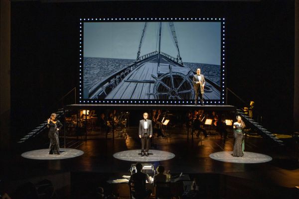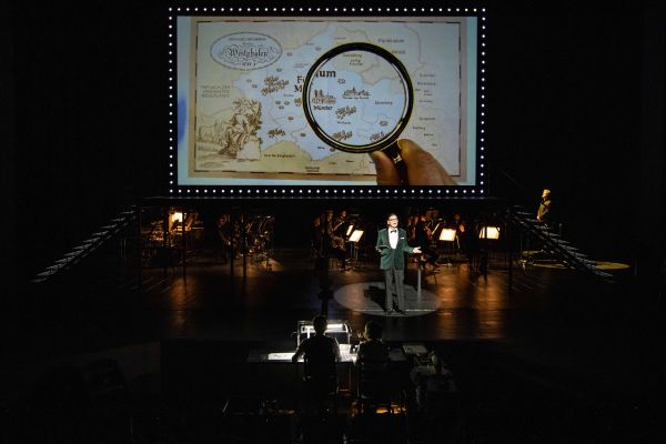 Angekündigt war eine konzertante Aufführung, es wurde weit mehr als das, nicht nur, weil die Mitwirkenden beweglich die Handlung andeuteten. Vielmehr projezierten als Live-Illustration auf eine grosse Leinwand Robert Nippoldt und seine Assistentin Saskia Kunze passend jeweils zur Handlung witzige Schrifttafeln, zeichneten mit Filzstift auf Landkarten die Reiserouten und malten satirische übertriebene Bilder der jeweils Beteiligten. Dies und die von Loriot für eine Aufführung in München verfassten die Handlung erklärenden Zwischentexte, vorgetragen in dessen Manier von Meinhard Zanger, sorgten für gute Laune und Lacher im Publikum.
