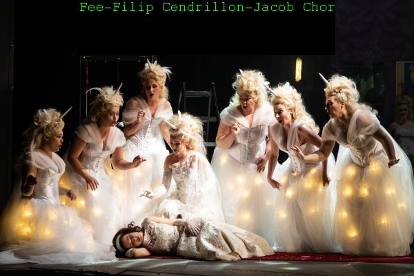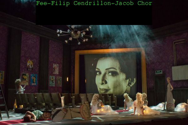 Etwas weit hergeholt war Anlaß dazu die Aufführung eines Stummfilms „Cendrillon“ im Jahre der Uraufführung der Oper 1899. So begann der Abend auf der ein Kino darstellenden Bühne (Bernhard Niechotz) mit einer Schwarz-Weiß –Aufführung des Happy-Ends eben dieses Stummfilms. (Video Oliver Berg) Während der Barockmusik nachempfundenen „Introduction“ des Orchesters stellte dann ein „Conférencier“ (Grégory Moulin) die im Kino anwesenden Hauptdarsteller vor. Von diesen sah man auf der Bühne ganz überflüssig Pappmaché-Figuren während der ganzen Vorstellung. Kinobetreiber war Vater Pandolphe, der „Prince charmant“ – hier „Märchenprinz“genannt – war der Leinwandheld und Aschenputtel mußte das Kino putzen, während Stiefmutter Madame de la Haltière mit Töchtern die Premierenfeier zwecks näherer Bekanntschaft mit dem Hauptdarsteller besuchen durften. Diese Premierenfeier fand statt im Restaurant „Belle Époque“ Durch entsprechende Lichteffekte konnte dies auch in die Zauberwelt der Feen verwandelt werden. Verbindung zwischen den Schauplätzen fand durch die Kinoleinwand statt, also etwa Fee durch die Leinwand ins Kino, Fee mit Aschenputtel zurück durch die Leinwand zur Premierenfeier – angeregt wohl durch ähnliche Zaubereien in Woody Allens Film„The purple rose of Cairo“.