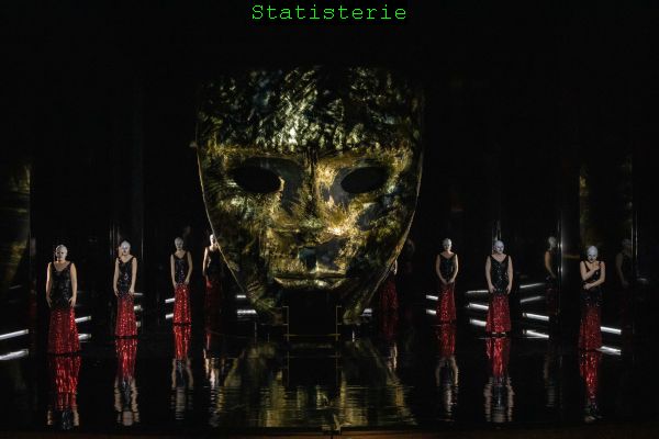 Dieses verfallende Haus als Zeichen des gestigen Verfalls von Roderick ahnte man zu Beginn auf der Bühne, während Teile des Bittbriefs von Roderick vorgetragen wurden. (dabei als Stimme Joachim Foerster) Dann wurde alles anders, denn der Regisseur wollte nach eigener Aussage "nicht die Musik platt bebildern" Vielmehr verwandelte sich durch Drehung die gesamte Bühnenmitte (Bühne ebenfalls von Sebastian Ritschel unter Mitarbeit von Sophia Debus) in eine riesige Maske, die wie die gesamte Handlung durch Spiegel als Bühnenboden und an den Seiten albtraumhaft verdoppelt wurde.