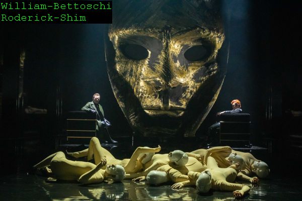 Zum Schluß tritt ja eigentlich Madeline der Gruft entkommend wieder auf. Hier sahen wir sie sowohl mit verbundenen Brandverletzungen und zum Schluß wohl dem Wahn Rodericks als Vollendung seines Kunstwerks entsprungen in goldenem Ganzkörpergewand mit langer Schleppe. Sängerisch beschränkt sich die Partie auf Vokalisen. Besonders zum Schluß gelangen diese Marielle Murphy durchdringend mit bis zu hohen Tönen leuchtendem Sopran ohne falsches Vibrato. Stimmlich bewältigten auch Youn-Seong Shim die Tenorpartie des Roderick und Filippo Bettoschi die Bariton-Partie des William in der Art überhöhten Sprechgesangs mit kräftigen Stimmen sehr passend zu den extremen Rollen und weitgehend textverständlich. Die Übertitel waren eigentlich nur notwendig, wenn sie im Duett oder zusammen mit Madeline zu dritt sangen.