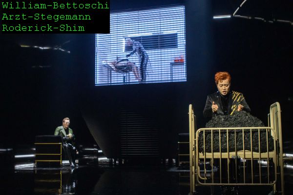 Der Wahnsinn von Roderick äusserte sich dadurch, daß er für die Aussenhaut dieser Maske Häute ermordeter Frauen benutzte. Wie mehrmals während der langen Orchesterzwischenspiele wieder durch Drehung der grossen Maske auf deren Rückseite in einem Operationszimmer zu sehen war, tötete der Arzt (in einer sängerisch kleineren Rolle Pascal Herington) diese Frauen mittels Spritze und zog ihnen Haut ab. Der Diener (in einer sängerisch noch kleineren Rolle Christoph Stegemann) schob diese dann auch immer wieder in einer Art Laborwagen über die Bühne. Diese im Programmheft als Opfer bezeichneten jungen maskierten Frauen sah man zwischendurch in unterschiedlichen aber für alle gleichen Kostümen und Masken (auch Sebastian Ritschel) wechselnd etwa zwischen Abendgarderobe und liegend als nackte Opfer auf der Bühne Als William dem Roderick eine Spieluhr in Form eines Totenkopfes als Erinnerung an die gemeinsame Kindheit überreichte, traten William, Roderick und Madeline dann im Rückblick als Jugendliche auf die Bühne, bei modernen Regisseuren heute üblich, wir sahen es noch neulich im Lohengrin in Dortmund.