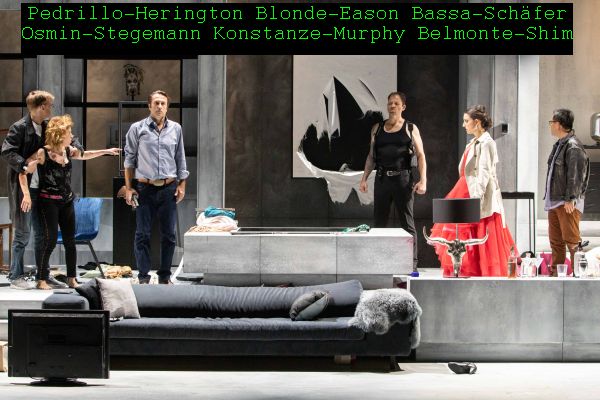 Aktualisiert wurde ganz anders, was im Programmheft ausführlich durch ungewohnte Interpretation der Handlung verdeutlicht wird. So stellte die Bühne von Emily Bates anstelle orientalischer Pracht eine moderne Eingangshalle mit kalten Betonwänden dar, geschmückt u.a. mit moderner Kunst, etwa. Giacometti´s Nase oder ein wie bei Yves Klein übliches blaues Gemälde. Diese wurden im Laufe der Handlung immer wieder beschädigt, die Bühnenbildnerin bezeichnet sich ja auch als performance designer. Den Mittelpunkt bildete ein vielfach nutzbares grosses Sofa, dahinter ein Wasserbecken, das im ersten Akt von den Sängern aus unerfindlichen Gründen zum Planschen genutzt wurde.
