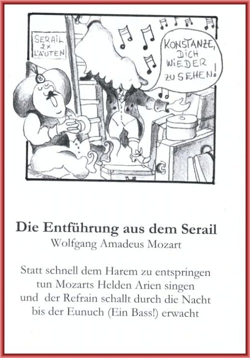 In diesem Rahmen wurden dargestellt Zuneigung und Liebe der beiden Frauen schwankend zwischen den um sie werbenden Männern, also Konstanze zwischen ihrem armen früheren Verlobten Belmonte und dem reichen Bassa Selim, bei dem sie wohnte, sowie Blonde zwischen Pedrillo und Sicherheitschef Osmin, dies nur möglich in heutigen Kostümen (Mathilde Grebot) Auf den Einsatz des Chors wurde verzichtet, nicht aber auf die für ihn bestimmte Musik. (Sparmaßnahme?) Es wurden neue Dialoge erarbeitet. Da hörte man wie heute üblich moderne Kraftausdrücke, z.B. Klugscheisser . Teile dieser neuen Dialoge wurden vor allem im ersten Akt auf Englisch gesprochen, vielleicht, weil die Darstellerin der Konstanze einen starken englischen Akzent hatte, wenn sie Deutsch sprach. Folgerichtig hatte der Bassa natürlich keine Möglichkeit, durch physischen Druck Konstanze zu halten.Er konnte nur versuchen, sie in Art eines goldenen Käfigs (Serail) an sich zu binden, einmal durch Singen eines englischen Schmachtfetzens (natürlich nicht von Mozart!) vor allem aber durch Möglichkeit luxuriösen Konsums, angedeutet wurden Luxus-shopping oder Bestellung von teurem candle-light-dinner. Dabei gescheitert konnte er zum Schluß dann nur noch Osmin mitzuteilen, daß die vier gehen wollten. Da es in dieser Fassung nichts zu verzeihen gab, wirkten die Danksagungen des Vaudeville übertrieben..
