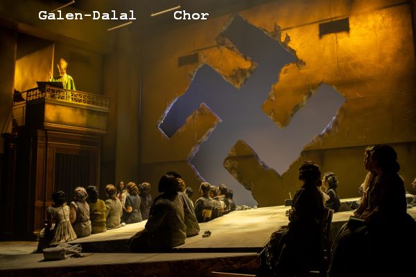 Grossen Anteil am Gelingen der Aufführung hatten Opern- und Extrachor einstudiert von Anton Tremmel. Das hörte man etwa bei sich steigernder Wiederholung der Worte aus Galens Predigt, nicht „Hammer sondern Amboß“ (der hält mehr aus!) wollten sie sein. Mächtig klang auch der Chor über den Psalm von der Zerstörung Jerusalems, mit dem die Luftangriffe und Zerstörung Münsters, wohl der Angriff am 10. Oktober 1943, beschrieben wurden. Ruinen ersetzten danach den Hintergrund des vorigen Bühnenbildes.