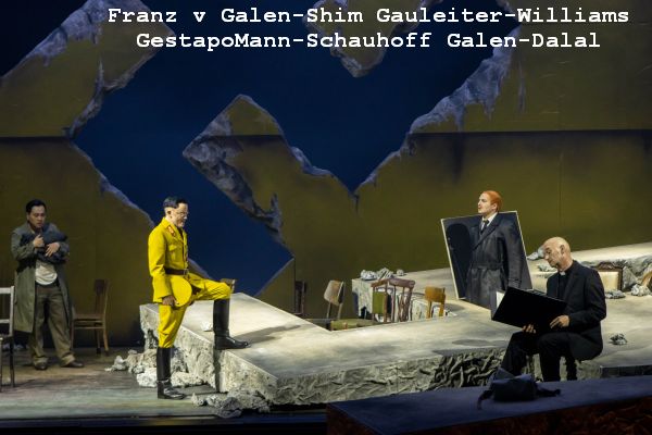 Mit hellem herrischen Tenor sang Mark Watson Williams den zackigen Gauleiter Meyer, in seiner Feindschaft gegenüber der Kirche noch übertroffen von Frederik Schauhoff als Gestapo-Mann. Erfreut war man über ein Wiedersehen und Wiederhören mit dem Bassisten Mark Coles als Regens Francken – so eine Art Vertrauter des Bischofs. Den noch engeren Vertrauten, nämlich Galens Sekretär, sang mit der jeweiligen Situation angepaßten Tenor Christian-Kai Sander. Als Galens Bruder Franz überzeugte mit anrührender Tenor-Stimme Youn-Seong Shim. Mächtige Baßstimme ließ Stephan Klemm als Galens Freund Coppenrath hören, der später auch einen englischen Offizier darstellte, der Galen nicht von der „Allgemeinschuld“ der Deutschen überzeugen konnte.