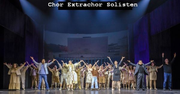 Grossen Anteil an der Aufführung hatten Chor und Extrachor in der Einstudierung von Anton Tremmel. Die vor Beginn vieler Szenen von Krenek vorgeschriebenen „Chorstimmen im Orchester“ kamen allerdings vom Bühnenhintergrund oder aus einer Empore im ersten Rang. Sonst war der Chor zu bewundern vor allem als wankelmütiges, im Anfang kriegsmüdes Volk Die Damen wirkten zusätzlich als Strassenmädchen in der Jahrmarktsszene. Alle bewegten sich häufig, wie auch Solistinnen und Solisten, im Rhythmus der Musik (Choreografie Alexander Novikov), z.B. mal ein Tänzchen zur Walzermusik, mal ein Totentanz nach der Ermordung von Aegisth und Klytaemnestra.