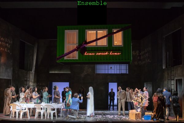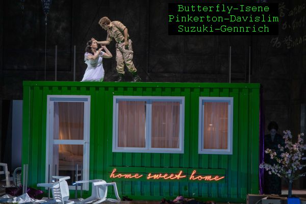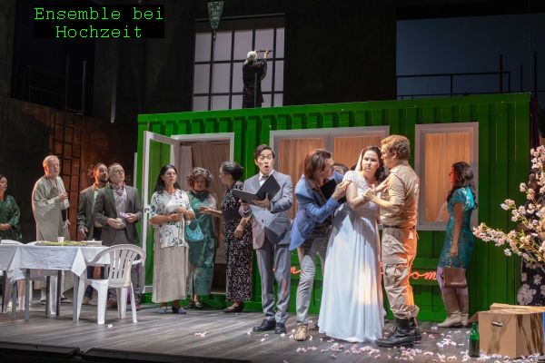 Das begann beim Bühnenbild:.(Bernhard Niechotz) Das von Pinkerton so bezeichnete „Häuschen“ mit „Liebesnest“(nido nuzial) war ein Wohncontainer mit der Aufschrift „home sweet home“, der als Hochzeitsgeschenk für Butterfly mit einer Schleife versehen von oben abgeseilt wurde. Über steile Leitern mußten Mitwirkende nicht nur auf dessen Dach sondern auch an den Wänden rauf- und runterklettern. Vor dem Container bereitete Butterfly picknickartig auf dem Boden das Hochzeitsmahl vor. Für die Gäste standen Gartenstühle und -tische bereit, die, wie kann es heute anders sein, umgeworfen wurden, hier wohl passend beim fluchtartigen Aufbruch der Hochzeitsgesellschaft nach dem Fluch durch Onkel Bonze (mit drohendem Baß Christoph Stegemann) wegen des Übertritts von Butterfly zum Glauben ihres Geliebten. Zum etwas kitschigen „Blumenduett“ des zweiten Aktes fielen zunächst Kirschblüten vom Bühnenhimmel, dann wurden lediglich gemalte und an die Wände geklebte Blumen.besungen.