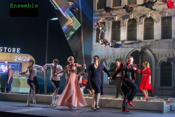 Leider drängte die Regie diese leidenschaftliche Opern-Handlung etwas in den Hintergrund gegenüber den darin verwobenen vielen kurzen heiteren Szenen in amerikanischer Broadway- und Musical – Manier. Dazu trugen alle Bewohner des Hauses und entsprechend viele Mitwirkende bei – ausser den genannten grossen Partien wirkten über zwanzig Sängerinnen und Sänger mit, erstaunlich, daß Münsters Theater die alle aus dem Ensemble besetzen konnte.