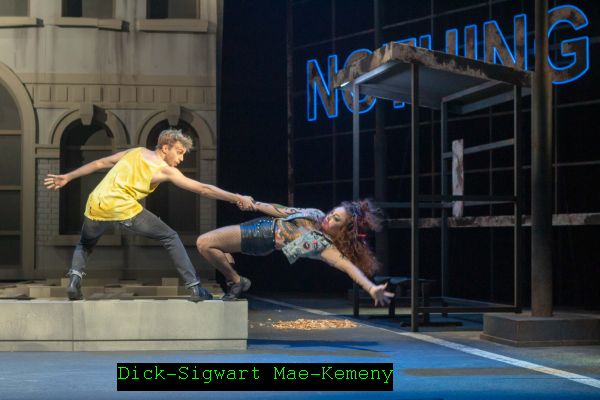Die Bühne von Rifail Ajdarpasic wurde begrenzt links durch einen Verkaufswagen, rechts durch eine Bushaltestelle mit der beleuchteten Überschrift NOTHING – solche überflüssigen geschriebenen Belehrungen des Publikums sind ja heute üblich. Ihren ganz besonderen Reiz erhielt die Aufführung durch den Bühnenhintergrund. Die Fassade des Mietshauses lag auf dem Bühnenboden und wurde durch einen riesigen Spiegel auf die Rückseite projeziert. Wenn Mitwirkende sich jetzt auf den Stegen über dem Bühnenboden oder auf diesem bewegten, erhielt der Zuschauer den Eindruck, sie hingen, kletterten oder tanzten an der Fassade auf und ab und hin und her. Ein bemerkenswerter Blickfang, an den man sich allerdings nach der Pause etwas gewöhnt hatte.