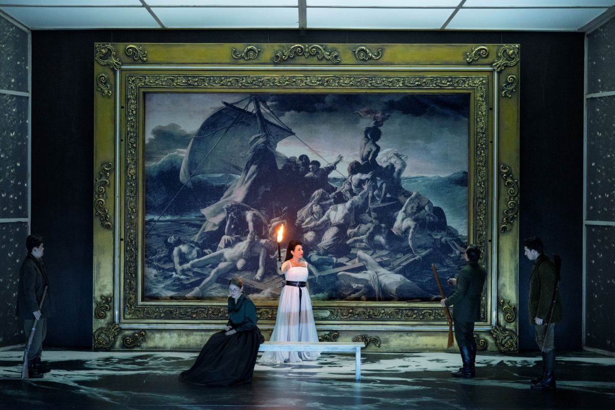 Den zweiten Akt dominiert auf der Bühne die Projektion von Géricaults monumentalem Bild „Floß der Medusa“ im goldenen Prunkrahmen. Vernichtung, Entmenschlichung, Untergang heraufbeschwörend, erschließt sich dieser Einfall im Zusammenhang mit dem zentralen Thema der Oper, der alle Konventionen sprengenden Liebe, nicht.