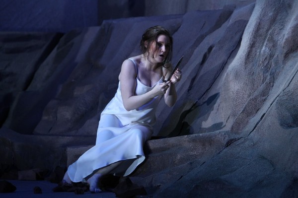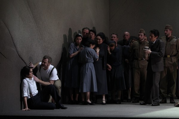 Die szenische Interpretation des Niederländers Floris Visser trägt nicht dazu bei, Traettas dröge Umsetzung zu beleben. Vielleicht sind der sandfarbene Einheitsbühnenraum und die mausgrauen Wirkwaren, in die Dieuweke van Reij die Protagonisten gehüllt hat, auch nicht der passende Rahmen, die antike Tragödie auf frische Art und Weise zu erzählen. Da kann auch das stimmungsvolle farbige Licht von Alex Brok nicht viel ausrichten. Beginnt die Oper noch mit einem lebendigen Messerkampf der Brüder, nimmt Visser der Handlung bald den Drive, setzt auf viel Herumgestehe und nur spärliche, wenn auch recht dramatische Interaktionen der Protagonisten. Irgendwie bleibt jeder allein und nur die beiden Liebenden, Antigona und Emone, lassen eine echte Beziehung zueinander erkennen. Unkommentiert erzählt der Intendant von Opera Trionfo, mit der zusammen diese Produktion entstanden ist und die sie ab Februar in den Niederlanden zeigt, die Geschichte, lässt jegliche Deutung außen vor und den Zuschauer damit auch ein Stück weit allein – und das ist heutzutage für ein antikes Drama wie „Antigone“ dann doch ein bisschen wenig.