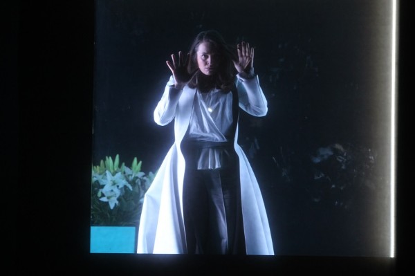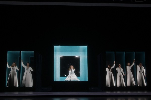 Wenn man den Zuschauerraum betritt, ist bereits ein großer Rahmen zu sehen, der die Bühne umgibt. DIDO steht rechts oben in der Ecke – und diese Bild beschreibt treffend, was wir in Osnabrück in der kommenden guten Stunde zu sehen bekommen. „Alles ist Dido“ möchte man resümieren, denn Dirk Schmeding nimmt den Titel der Oper, der auf Vergils Aeneis fußt, wörtlich und zeigt nur zwei Figuren: eben Dido, die Gründerin Karthagos und noch vor der Hochzeitsnacht zur Witwe geworden, und Aeneas, trojanischer Sohn der Göttin Aphrodite. Alle anderen Protagonisten sind nur Facetten von Dido selbst: die umsorgende Belinda, der aufmunternde Chor, die böse Zauberin und ihre Hexen sind allesamt nur Teile von Didos Persönlichkeit. Sinnfällig dargestellt ist das sowohl in den türkisenen Kammern, die Martina Segna auf die Osnabrücker Bühne gestellt hat und in denen die einzelnen Figuren – von Plexiglas umschlossen – gefangen sind, aber auch im gleichen schicken Rockmantel, in den Frank Lichtenberg alle Sängerinnen und Sänger hüllt. Dido ist in ihrer Trauer, in ihrer eigenen Welt gefangen, dem stürmischen Womanizer Aeneas gelingt es nicht, zu ihr durchzudringen, auch wenn sie sich nach Nähe sehnt. Die Jagdszene, die bei Schmeding die Jagd von Aeneas nach Dido zeigt, ist sexuell aufgeladen, endet jedoch als erotischer Rohrkrepierer. Intimität zulassen kann Dido nicht – und so sind auch die Videoeinspielungen von Johannes Kulz für den Zuschauer die einzige Möglichkeit, sich Dido zu nähern und ihre Augen, Spiegel zur Seele und wohl deshalb von den Sängerinnen und Sängern über weite Strecken mit Sonnenbrillen bedeckt, und ihr Gesicht in Close-ups zu sehen und Emotionen sehr unmittelbar wahrzunehmen. Ich persönlich bin zwar grundsätzlich kein Freund von offen inszenierten Schlußszenen, wie Schmeding sie gestern zeigt – das aber ist gestern nur ein kleiner Wermutstropfen in einem ansonsten rundum gelungenen, tiefgründigen Psychogramm der weiblichen Titelfigur.