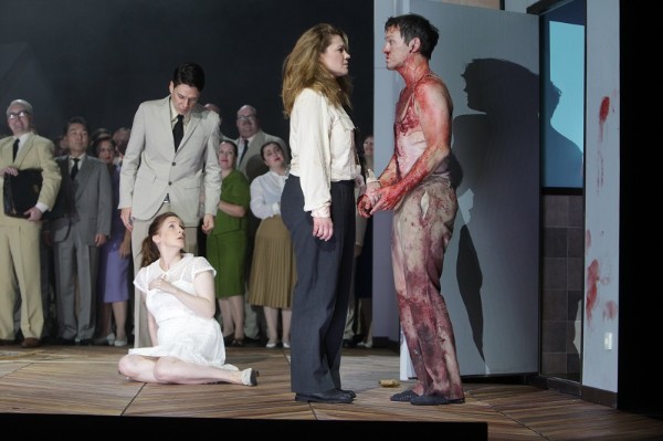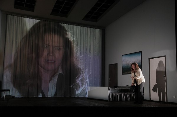 Ein politisch Gefangener gefährdet den Ruf eines Gouverneurs, als der zuständige Minister seinen Besuch ankündigt. Gleichzeit versucht seine Frau, als Mann verkleidet, ihn aus dem Gefängnis zu befreien. Dieser Plot scheint wie gemacht für eine Aktualisierung in unsere Tage hinein, eine Verlegung der Handlung in einen heutigen Terrorstaat und als Anprangerung von Menschenrechtsvergehen aller Art. Die südkoreanische Regisseurin Yona Kim allerdings, in Osnabrück mittlerweile zum vierten Mal mit einer szenischen Umsetzung betraut, legt die Oper eher als Innensicht von Leonore an, thematisiert die politischen Momente nur am Rande und verortet die Handlung in der örtlich nicht näher spezifizierten Gegenwart. Die Titelfigur ist omnipräsent, er-lebt alles im eigentlichen Sinne, so wird sie mit ihren Ängsten und Hoffnungen zum Zentrum der Inszenierung. Dabei arbeitet Kim geschickt mit Videoeinspielungen, die teils von Siegfried Köhn vorgefertigt wurden und einen Blick auf Leonores Gedankenwelt ermöglichen, teils live während der Aufführung gefilmt einen intensiveren Eindruck von der Mimik der Protagonisten widergeben und so eine zusätzliche Dimension eröffnen. Der Einheitsbühnenraum zeigt das Schlafzimmer des Ehepaares, bei dem – so zeigt es die bespielte Ouvertüre – nicht alles im Lot scheint, als Florestan verhaftet wird. Durch raffinierte Verwandlungen, die Bühnenbildner Alexandre Corazzola geschickt ermöglicht, verschwinden Bett und Schminktisch in Sekundenschnelle, öffnet sich hinter dem Schlafzimmervorhang der Bühnenraum zu einer Art Retortenstadt, in der sich alle Häuser und alle Menschen gleichen, tragen sie doch sämtliche Schattierungen von Beige (Kostüme: Falk Bauer). Lediglich Florestan scheint in literweise Theaterblut gewälzt, und bleibt damit auch unter den Gefangenen ein anderer. Yona Kim hat gut daran getan, die Dialoge gänzlich zu streichen und sie durch kurz zusammenfassende Texteinblendungen zu ersetzen. So kann sich Beethovens Musik nahezu ununterbrochen in einen Fluß begeben, was der Wirkung des Werkes letztendlich zuträglich ist und die intensive Wahrnehmung der Inszenierung durch die Zuschauer erst ermöglicht.