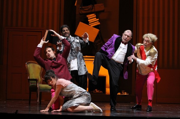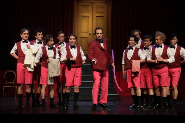 Ensemble-Theater stehen mitunter vor dem Problem, dass sie manche Partien nicht mit eigenen Sängern besetzen können und deshalb auf Gastsolisten zurückgreifen müssen. Von außen betrachtet böte sich damit die Möglichkeit, wirklich rollengerecht zu besetzen – und immer wieder ist zu beobachten, dass Theater diese Gelegenheit nicht nutzen. Das scheint viel weniger nachvollziehbar, da man in so einem Fall ja nicht Herrn X die Rolle Y, die nicht ganz zu Umfang und Farbe passt, singen lassen muss, nur weil er im Ensemble ist, sondern auf dem freien Markt vermeintlicherweise aus dem Vollen schöpfen kann. Deshalb ist es schwer zu erklären, dass die Rolle des Prinzen Don Ramiro in die Hände des Gastsolisten Miloš Bulajić gelegt wurde. Der Spross einer serbischen Musikerfamilie verfügt durchaus über rossinihaft-schlanke Höhe voll großer Klarheit, die Spitzentöne der Partie erreicht er scheinbar mühelos und zeigt dazu gern, über wieviel Kraft er dabei verfügt. Doch sein Brustregister klingt dagegen derart unausgewogen, stark tremolierend und beinahe brüchig, dass der Gesamteindruck doch hinter der Leistung des angestammten Sängerpersonals zurückbleibt. Das mag auch daran liegen, dass seine Bühnenpartnerin Olga Privalova, die am gestrigen Abend die Cenerentola überhaupt erst zum zweiten Mal singt, stimmlich und darstellerisch derart auftrumpft, dass man dagegen nur verlieren kann, wenn man nicht vollends abliefert. Die aus Litauen stammende Mezzosopranistin ist seit dieser Saison im Osnabrücker Ensemble und zeigt neben einer satten Tiefe eine beeindruckende Geläufigkeit und emotionalen Tiefgang und setzt dieser gesanglichen Topleistung mit ihrem schauspielerischen Talent das Sahnehäubchen auf. So verkörpert sie glaubhaft die Verwandlung vom schüchternen, unterdrückten Aschenputtel zur so schönen wie selbstbewussten Frau, die den vermeintlichen Kammerdiener um sich kämpfen lässt.