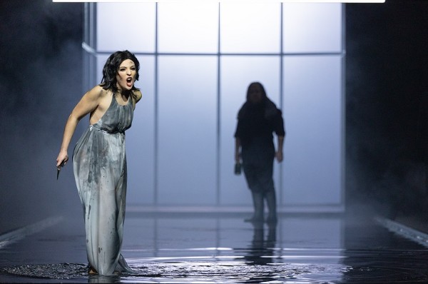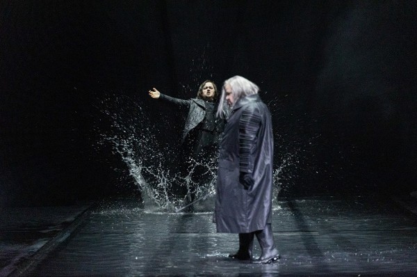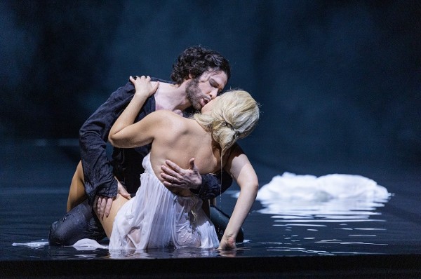 Bei Sam Brown ist alles schwarz. Mäntel, Stühle, Haare, Kostüme, Schuhe – ohne die ausgefeilte Lichtregie wäre gar nichts von den Kostümen von Sarah Mittenbühler zu erkennen. Wäre da nicht sie, Lucia, die Lichtgestalt, blond und weiß gekleidet – zumindest, bis sie zur Mörderin und verrückt geworden ist, strahlend und Mittelpunkt von allem. Kein schlechter Ansatz, möchte man meinen, der zusammen mit den Videos von Per Rydnert nicht nur Stimmungen erzeugt, sondern die dunklen Abgründe, die Seelenzustände der Protagonisten zeigt. Doch wann ist wer auf die Idee gekommen, ein ungefähr 4 mal 15 Meter großes Wasserbassin auf die Bühne von Bengt Gomér zu stellen und alle permanent darin herumplantschen, umherwaten und sich ins Nass niedersinken zu lassen. Und vor allem: warum? Die Antwort bleibt der Regisseur schuldig, so bleibt das Ding über weite Strecken so sinnlos wie überflüssig. Verstehen Sie mich nicht falsch, lieber Opernfreund-Freund, es sind mitunter stimmungsvolle Bilder, die Sam Brown da gelingen, gerade die Wahnsinnsszene macht Gänsehaut; das hätte sie aber wohl auch ohne das Element Wasser, ohne die zusehends enervierende akustische Beeinträchtigung und das allgegenwärtige Plitschplatsch. Das ist so schade, weil doch sonst alles so schön klingt am gestrigen Abend.