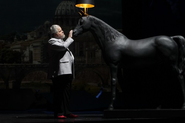 Sicher muss man das Rad nicht immer neu erfinden und vielleicht hat man Scarpias Schergen auch schon irgendwie zu oft in Gestapo-Mänteln oder in der Uniform eines mehr oder minder realen Terrorstaates heutiger Tage gesehen. Wenn man aber einer Aktualisierung nichts anderes abgewinnt als nichts sagende Symbolismen und die heutige Mode, dann kann man Tosca auch gleich ins rote Samtkleid stecken, Cavaradossi mit Plastron und den Polizeichef mit gepuderter Perücke ausstatten. Mascha Pörzgens Ideen zu einer Aktualisierung des Werkes jedenfalls erschöpfen sich in halbgaren Ansätzen. Symbole wie die Körperteile als Wandschmuck, denen keinerlei Bedeutung zukommt, bleiben ebenso überflüssig wie die als Druidenpriesterinnen daherkommenden Jungfrauen, die dem Klerus zum Te Deum die Maschinenpistolen zur Waffenweihe entgegenstrecken. Staat und Kirche scheinen nicht getrennt in diesem Rom, darauf deuten die Polizeiuniformen hin, deren Muster sich in den Messgewändern wiederfindet; doch auch dieser Geistesblitz wird nicht mit Substanz unterfüttert und bleibt Kulisse. Zwar überzeugt die durchaus spannende Personenführung Pörzgens – gerade, wenn nur zwei Handelnde auf der Bühne sind, jedoch wirken Toscas Versuche, den toten Scarpia noch schöner unter die lebensgroße Pferdeleuchte zu drapieren, ebenso grotesk wie die roten Papstschühchen, die Scarpia im zweiten Akt tragen darf. Kostüme und Bühne werden von Frank Fellmann verantwortet, dessen Arbeit dann am stärksten ist, wenn er das macht, was er in dieser Inszenierung wohl machen soll, nämlich eine Bebilderung zu kreieren – so dass der in allen Facetten erstrahlende Petersdom im Hintergrund zum szenischen Höhepunkt gerät.
