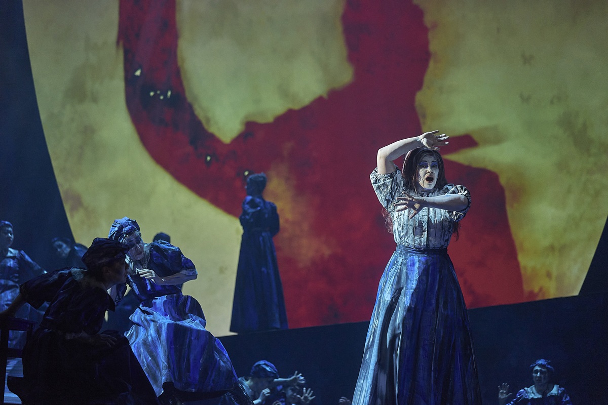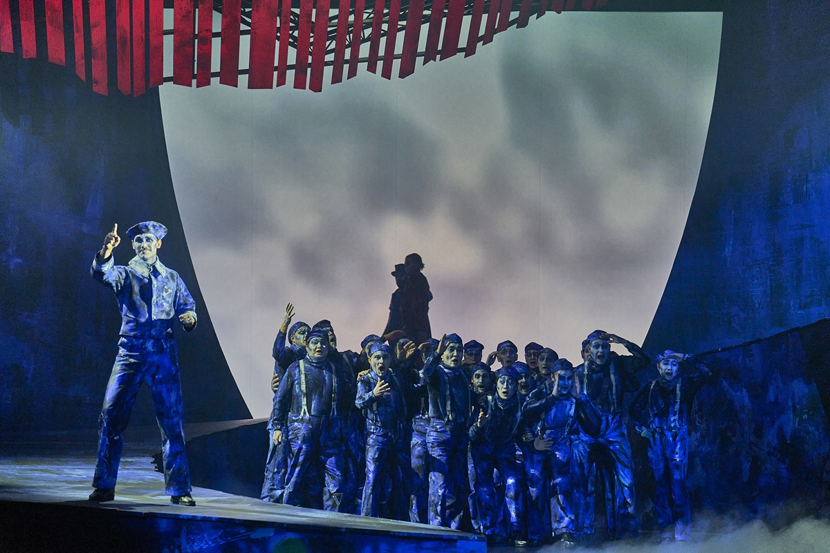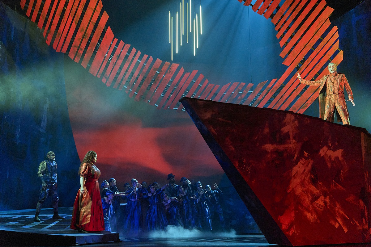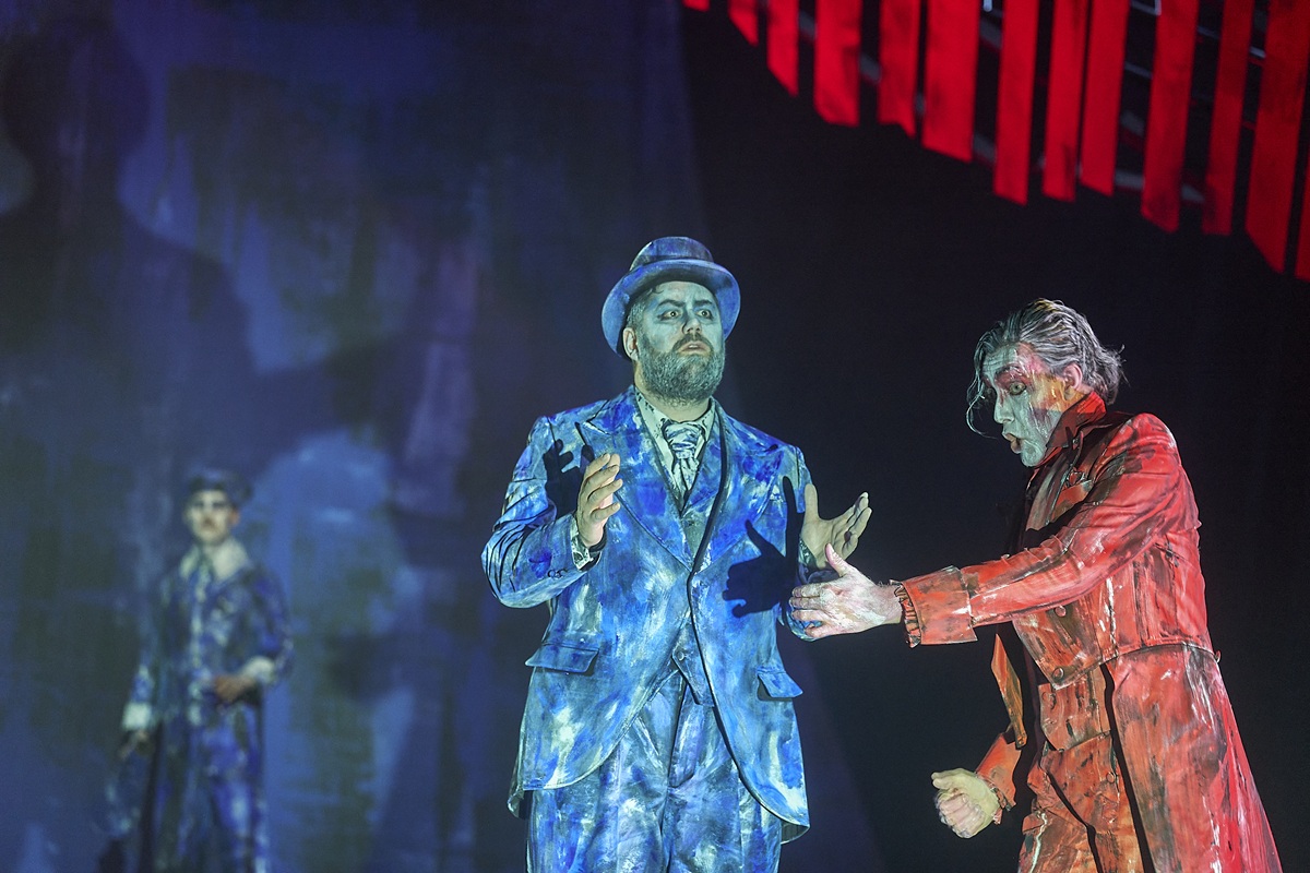 Die Inspiration für seine Interpretation zieht Dennis Krauß aus dem Werken des Norwegischen Malers Edvard Munch und scheint sich hier vor allem auf dessen Bild Vampir (https://de.wikipedia.org/wiki/Vampir_(Munch)) zu fokussieren. Die Farbgebung in seinem Holländer scheint 1:1 aus diesem Bild entnommen – Daland, Erik und Konsorten kommen in Blau daher, der Holländer in feurigem Rot. Das gibt ihm schon von Beginn an etwas Teuflisches und der niederländische Bass-Bariton Martin-Jan Nijhof, der die Titelpartie als Gast übernimmt, unterstreicht diese Facette mit seinem prachtvoll-verführerischen Gesang, der mächtig über den Graben schallt und doch weit entfernt ist von so manch grobschlächtiger Interpretation der Titelfigur aus Wagners erster Erfolgsoper. Die Drehbühne wird von einer Rampe beherrscht, die mit Licht und Schatten spielt und wie ein Schiff aus dem Trockeneisnebel auftaucht. Die Protagonistinnen und Protagonisten wirken wie von Munch mit grobem Pinselstrich ge- bzw. bemalt und unterstreichen den märchenhaften Ansatz von Krauß. Der hat sich überdies Hilfe vom der israelischen Choreografin Gal Feffermann geholt und lässt das Sängerpersonal genau abgestimmte Bewegungen ausführen. Das scheint bisweilen ein wenig gekünstelt und aufgesetzt – doch genau dieser Effekt ist gewollt und unterstreicht die Wirkung, als habe man gerade in einem Bilderbuch die nächste Seite aufgeschlagen.