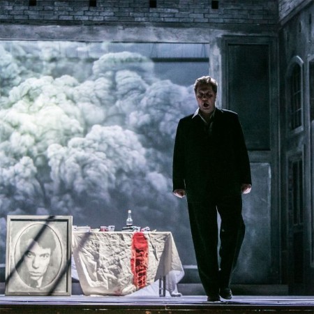Silviu Purcarete setzt bei seiner Inszenierung auf ein Gemisch naturalistischer und traumhaft-surrealer Elemente. Dabei erzählt er das Ganze aus der Perspektive des als Alter Ego Pasternaks vorgeführten Schiwago. Helmut Stürmer hat ihm einen karg-nüchternen Raum auf die von vorbeiziehenden grauen Wolkenprojektionen beherrschte Bühne gestellt. Dessen fehlendes Dach spielt auf einen Kernsatz des Werks an: „Russland hat sein Dach verloren nachts im Sturme“. Über eine visuelle Impression wird hier gleichzeitig Revolution und Patriotismus ins Spiel gebracht. Die bereits zu Beginn projizierten russischen Soldaten des Ersten Weltkrieges zeigen, das Purcarete die Handlung in der erzählten Zeit spielen lässt, worauf auch die Kostüme von Corina Gramosteanu hinweisen, und dabei ohne jegliche Verfremdungen auskommt. Er spricht „Doktor Schiwago“ ganz zu Unrecht seine Bedeutung für die heutige Zeit ab und inszeniert brav am Textbuch entlang. Mit Hilfe der häufig eingesetzten Drehbühne sowie von Podien und Versenkungen wird ein breites räumliches Spektrum erzeugt. Das mit Krankenbetten ausgestattete Lazarett weicht zuerst einem Bunker, später einem politischen Zentrum und dem Haus von Schiwago und Lara. Sie sind nur noch Marionetten in den Händen von Komarowski, was seitens der Regie durch drei Puppen trefflich versinnbildlich wird. Hier nimmt das Geschehen zudem den Charakter eines Kammerspiels Strindberg’scher Prägung an. Zunehmend wandelt sich die Realität zu einem Alptraum und mutieren Gas- zu Tiermasken, die praktisch den ganzen Abend über präsent bleiben. Strelnikow hält seinen Disput mit Schiwago von einem versenkten Badezuber aus, in den später auch Kubaricha steigt. Die von ihm gepflegte Revolution ist indes erfolglos. Sie vermag dem zugeschneiten Kreml nichts mehr anzuhaben, mag Strelnikow auch noch zu sehr die rote Fahne schwingen. Die intendierte politische Erneuerung ist gescheitert, genau wie die Liebe von Schiwago und Lara, die ihren großen Schlussmonolog an seinem Sarg singt. Insgesamt haben wir es hier mit einer insgesamt soliden Inszenierung zu tun, der aber leider der durchaus vorhandene aktuelle Bezug fehlt. An das, was beispielsweise eine Andrea Moses aus dem Stoff gemacht hätte, darf man gar nicht denken.