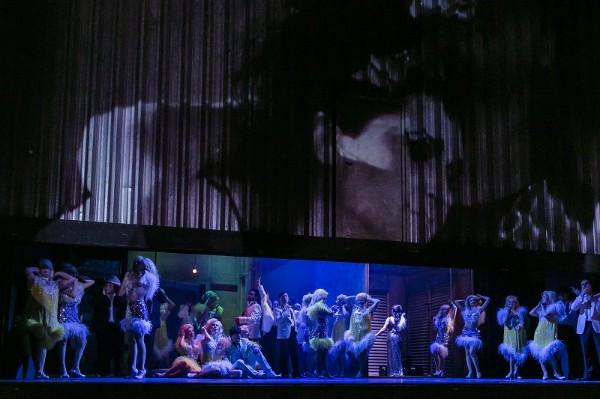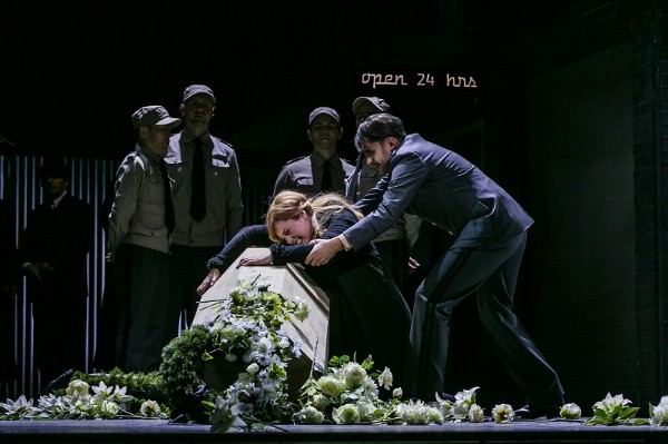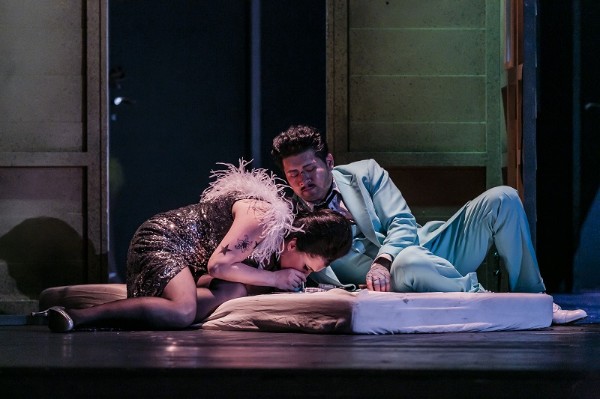 Eigentlich muss man sagen, dann in Regensburg ändert Regisseur Hendrik Müller die Handlung in mehreren Gesichtspunkten, so dass die Chance vertan wird, bei dieser deutschen Erstaufführung eines Puccini-Werkes das zu zeigen, was Puccini und sein Librettist Ferdinando Fontana sich ursprünglich ausgedacht hatten. In die USA der 50er Jahre verlegt Müller die Handlung, zeigt Tigrana nicht nur als Außenseiterin der Gemeinschaft, sondern als Barbetreiberin und Dealerin – die also quasi alles liefert, was der unzufriedene Edgar sich erträumt. Dabei helfen ihm die gelungenen Videoeinspielungen, die Michael Lindner produziert hat, und die Innenwelt und Parallelhandlung gekonnt verdeutlichen, wenn sie auf die kargen Zinkwände der Kulisse projiziert werden. Die Drehbühne von Marc Weeger, der auch für die tollen Kostüme verantwortlich zeichnet und beispielsweise dadurch Lokal- und Zeitkolorit auch jenseits des Wildwest-Klischees schafft, dass er im zweiten Akt die Damen des Chores als Marilyn-Monroe-Doubles in gelbe Paillettenkleidchen steckt, zeigt einen tristen amerikanischen Straßenzug samt rund um die Uhr geöffneter Bar, die Tigrana betreibt. Tigrana und Edgar erinnern zwar in ihrem extatischen Trip aus Alkohol, Drogen, Kriminalität und Lust wie eine Opernausgabe von Bonnie & Clyde, doch dieser Ansatz passt hervorragend. Müllers Personenführung ist spannungsreich und haucht der konstruierten Story gekonnt Leben ein. Dass er Fidelia als unehelich schwanger Gewordene zeigt, verschärft die Situation. Im letzten Akt – dem zuvor in Deutschland nie gezeigten – lässt er sie sich die Wiedervereinigung mit Edgar allerdings nur im Wahn erträumen. Fast überflüssig zu erwähnen ist, dass sie das Kind verloren hat, der Mord durch Tigrana erscheint beinahe wie ein Unfall und auch das Finale steht so nicht im Libretto Fontanas. Das ist schade, setzt aber den Veränderungsprozess, den Puccini selbst dem Werk immer wieder hat angedeihen lassen, konsequent fort. So wird zumindest nun ein anderes deutsches Haus damit werben können, den vieraktigen „Edgar“ erstmals so zu zeigen, wie Puccini es sich ursprünglich gedacht hatte.