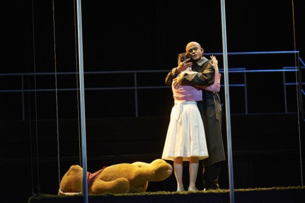 Bleibt noch die Inszenierung von Brigitte Fassbaender, die insgesamt nicht sonderlich zu befriedigen vermochte. Sie und ihre Bühnen- und Kostümbildnerin Dorit Lievenbrück huldigten optisch der sog. Neuen Sachlichkeit. Sie siedeln die Handlung in einer metallenen Treppenformation an, die sich im dritten Akt dreht und dann die Behausung Sparafuciles und Maddalenas bildet. Dabei entsteht der Eindruck, die mörderischen Geschwister würden unter einer Brücke hausen. Ihr Hauptaugenmerk richtet die Regisseurin auf die zwischenmenschlichen Beziehungen. Das Obsessive in der Beziehung zwischen dem im herkömmlichen roten Narrengewand auftretenden Rigoletto und Gilda, der ein riesiger Plüsch-Teddybär als Ausdruck ihrer Kindlichkeit zugeordnet ist, wird von ihr einfühlsam herausgearbeitet. Auch nimmt Frau Fassbaender der Titelfigur ihren traditionellen Buckel und lässt tiefe Narben an dessen Stelle treten. Das wird offenkundig, wenn der glatzköpfige Narr zum zweiten Bild hin seinen Oberkörper entblößt. Ein guter Einfall war, dass der Duca im zweiten Akt vor den Photos seiner erst verführten, dann einfach weggeworfenen Verflossenen agiert, zu denen sich dann auch das Bild Gildas gesellt.