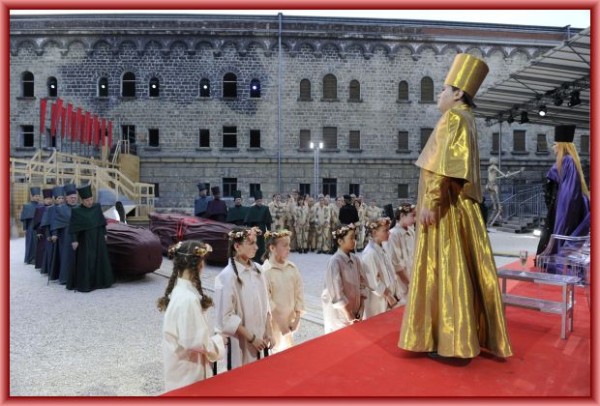 Alle zwei Jahre zieht das Theater Ulm mit einer Musikproduktion auf die nahe Wilhelmsburg. Bisher waren das im wesentlichen Musicals. In diesem Jahr entschloss man sich, zum ersten Mal im weiten Innenhof der Burg eine Oper aufzuführen. Die Wilhelmsburg ist eine vom Deutschen Bund finanzierte Landesfestung und wurde 1842 bis 1859 vom preußischen Festungsbaudirektor und damaligen Oberst Moritz Karl Ernst von Prittwitz und Gaffron entworfen sowie unter seiner Leitung erbaut. Als erste Oper im weiträumigen Innenhof der Festung entschied sich das Theater Ulm für Giuseppe Verdis „Aida“. Regisseur Matthias Kaiser und sein Dramaturg Benjamin Künzel wählten mit der Bühnenbildnerin Britta Lammers und der Kostümbildnerin Angela C. Schuett, die geschmackvoll sowohl klassische wie auch aktuelle Aspekte in sich vereinende Kostüme schuf, ein traditionelle und zeitgenössische Theaterelemente zusammenführendes Regiekonzept, das bisweilen etwas experimentell wirkt, aber im Großen und Ganzen gelang.