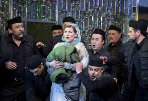 Bleibt noch die Inszenierung von Sabine Sterken im Bühnenbild und den Kostümen von Martin Rupprecht. Sicherlich war es kein Fehler, jeglichem altbackenem spanischem Folklore-Kitsch abzuschwören und mit einer eher abstrakt-nüchternen Regiearbeit aufzuwarten, die zudem symbolisch und psychologisch ausgerichtet war. Frau Sterken siedelt das Geschehen demgemäß auch nicht in Sevilla an, sondern in einem neutralen Ambiente, in dem Angehörige der verschiedensten Nationen aufeinandertreffen. Dem entspricht es, dass die von der Regisseurin persönlich neu eingerichteten Dialoge manchmal in unterschiedlichen Diktionen gesprochen werden. Trefflich wird dadurch zum Ausdruck gebracht, dass die hier behandelten Konflikte um Liebe und Eifersucht nicht örtlich begrenzt sind, sondern in allen Ländern der Welt auftreten können. Wenn von den beiden Schmugglern dann doch mal herkömmliche Folklore-Kleider an die Zigeunerinnen verteilt werden, ist das nur als Reminiszenz an einen längst überkommenen Aufführungsstil zu werten, wie er beispielsweise in der Arena von Verona praktiziert wurde. Den Regenschützen, die dort bei schlechtem Wetter an das Auditorium verteilt werden, ist das nicht so ganz gelungene Kostüm von Micaela nachempfunden. Zwar räumt das Regieteam hier ganz schön mit Klischees auf, bringt dafür aber neue ins Spiel, was nicht unbedingt hätte sein müssen.