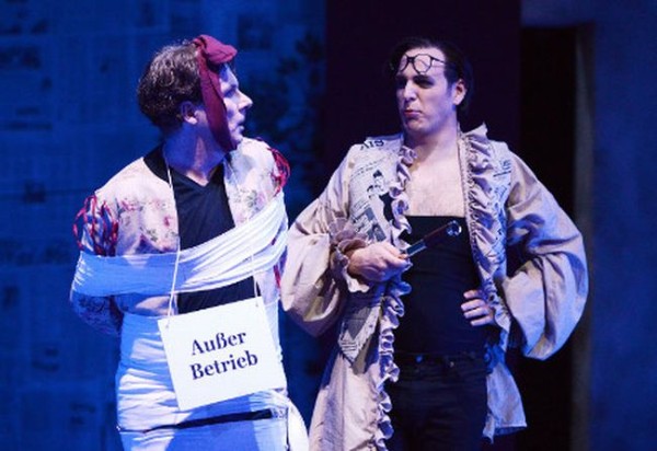 Auf hohem Niveau bewegten sich die gesanglichen Leistungen. Es ist immer wieder erstaunlich, über was für ausgezeichnete Sänger gerade die kleinen und mittleren Häuser doch verfügen. Da ist das Theater Würzburg keine Ausnahme. In der Titelrolle brillierte der junge Daniel Fiolka. Schlank, großgewachsen und blendend aussehend war er schon rein äußerlich ein idealer Don Giovanni. Darstellerisch ging er mit prägnantem und abwechslungsreichem Spiel voll in seiner Rolle auf. Auch stimmlich hinterließ er mit seinem vorbildlich italienisch focussierten, frischen und ausdrucksstarken Bariton einen hervorragenden Eindruck. In Nichts nach stand ihm Johan F. Kirsten, der einen schauspielerisch köstlichen Leporello abgab und seiner Rolle mit kräftigem, profundem Bass auch vokal voll entsprach. Prachtvoll schnitt der über einen wunderbaren sonoren Bass bester italienischer Schulung verfügende Ji-Su Park in der Partie des Masetto ab. Anke Endres stattete die Donna Anna mit gut gestütztem, intensiv und farbenreich geführtem Sopran aus. Bemerkenswert ist das „Or sai chi l’ onore“, das sie entgegen der Konvention weniger dramatisch als vielmehr lyrisch-verhalten und mit bedächtigen Pianotönen zum Besten gab. Barbara Schöller bewältigte mit gut sitzendem, imposantem Mezzosopran die hoch liegende Sopran-Tessitura der Donna Elvira vortrefflich und vermochte auch schauspielerisch zu gefallen. Eine ziemlich resolute, mit vollem rundem Sopran singende Zerlina war Anja Gutgesell. Lediglich einen mittelmäßigen Eindruck hinterließ der insbesondere in der Höhe nicht gerade viel vokale Dämonie verströmende Commendatore von Marek M. Gasztecki. Nicht mein Fall war Joshua Whitener, der den Don Ottavio mit nur dünnem, jeglicher soliden stimmlichen Anlehnung entbehrendem Tenor sang. Er sollte sich um eine tiefere Stütze seiner Stimme bemühen. Eine solide Leistung erbrachte der von Michael Clark einstudierte Chor.