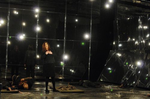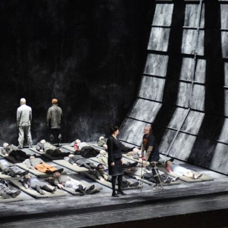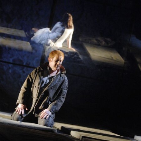 Eindrucksvoll präsentiert der Regisseur so eine zwei Aufzüge andauernde Momentaufnahme der Todessehnsucht von Tristan und Isolde und dringt einfühlsam in die innersten Bereiche ihrer Psyche sowie allgemein in die Grenzbereiche menschlicher Existenz vor. Die Zeit scheint still zu stehen. Für die Liebenden wird sie indes zu einer Ewigkeit. Eine am Ende des ersten Aufzuges im Hintergrund erscheinende Spiegelwand reflektiert ihr Innerstes wider und weist ihnen den Zugang in eine bessere Welt – weg vom Totenduft, der den ganzen ersten Aufzug prägt. Tristans Schiff ist ein von Falko Herold – von ihm stammen auch die Kostüme, Videos und Animationen – entworfenes Gespensterschiff, dessen geisterhafte Besatzung aus Zombies und Vampiren eher dem Fliegenden Holländer als einem Ritter aus Kornwall zuzuordnen ist. Ein fahles Schreckgespenst von Seemann, der auch den Hirten gibt, ist der Anführer dieser Spukgesellschaft, die ständig präsent ist und das Paar auf seinem mentalen Weg begleitet. Sie alle scheinen traumatisierte Opfer des vorangegangenen Krieges zwischen Irland und Kornwall zu sein, die den Titelfiguren ein Entkommen aus dem beengten Raum gnadenlos verwehren wollen und sie in eine ausgeprägte Existenzkrise drängen, der sie nichts entgegenzusetzen haben. Ihrem an Schopenhauers Pessimismus gemahnenden Schmerz korrespondieren die lebensbejahenden Mentalitäten des ein Superman-T-Shirt tragenden, glatzköpfigen, schmierigen und äußerst beleibten Kurwenal und der als leger gekleideter moderner Teenager vorgeführten Brangäne, die leiblichen Genüssen alles andere als abgeneigt sind. Sie ziehen sich immer von Tristan und Isolde zurück, wenn diese ihrem Todesverlangen nachhaltig Ausdruck verleihen. Am Ende schließt sich der Kreis: Die ursprüngliche Zeit tritt wieder ein, aber die Umwelt ist jetzt eine andere als im ersten Aufzug.