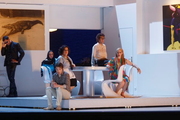 Denn auch in Toulouse engagiert man inzwischen für die Musik wirkliche Experten und für die Inszenierung Opern-Fremde Künstler, von denen man sich eine „neue Sichtweise“ auf altbekannte Werke erhofft. In dieser Hinsicht wurden wir nicht enttäuscht und sahen Vieles, was wir noch nie in einer „L’italiana in Algeri“ und überhaupt auf einer Opernbühne gesehen haben. Laura Scozzi ist in Frankreich vor allem bekannt als langjährige Choreographin des Regisseurs Laurent Pelly, für den sie viele lustige Tanzeinlagen ausgedacht hat. 2008 debütierte sie in Nürnberg als Opernregisseurin und hat dort schon fünf Opern inszeniert. Scozzi verlegte die Handlung von Algerien nach Italien und gab dem Bey die sexuellen Vorlieben des Ex-Premiers Berlusconi, der – wie Mustafà – seiner angetrauten Gattin(en) etwas überdrüssig ist und von einer spritzigen Ausländerin träumt. Deswegen will Mustafà seine Frau Elvira mit seinem italienischen Sklaven Lindoro verheiraten. Doch dieser ist in die schöne Isabella verliebt, mit der in der Schlussszene aus dem Harem des Beys entflieht.