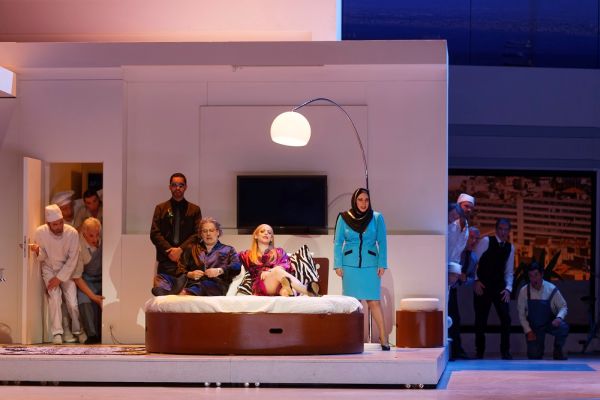 Der Opernabend fängt an mit Ausdruckstanz: Elodie Ménadier und Olivier Sferlazza kopulieren, schlagen sich und bringen sich auf verschiedene Arten um: mit Beilen, Schlachtermessern, Plastiksäcken etc. Sie präsentieren uns bei jedem Bühnenwechsel „Szenen einer Ehe“ und es fließt literweise Theaterblut. Die aufwendige und leider nicht geräuschlose Drehbühne von Natacha Le Guen de Kerneizon führt uns jedes Mal wieder ins Schlafzimmer des Beys, wo Mustafà akrobatischen und fantasievollen Sex hat mit sechs „Playgirls“, die man anscheinend im Pariser Crazy Horse ausgeliehen hat. Doch für diese „Bunga-Bunga“ müssen die Schönheiten sich mit allen möglichen Sado-Maso-Utensilien abmühen, die wir nicht weiter beschreiben wollen, da sie – nach unserer Meinung – nichts in diesem Stück und überhaupt auf einer Opernbühne zu suchen haben. Sehr befremdend auch der „tabledance“ von Manon Cassini, einer professionellen „stripteaseuse“, die bei Rossini genau so fehl am Platze scheint wie vor kurzem ein professioneller Pornoschauspieler in Wagners „Venusberg-Szene“ (auf einer anderen Opernbühne).