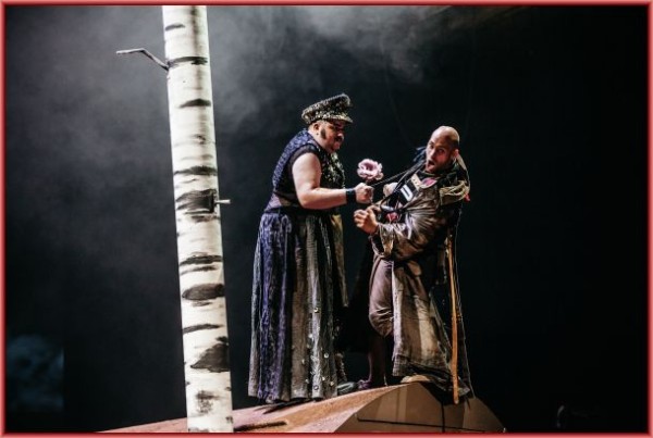 Mit dem Reiz hatten er und sein Ausstatter Simon Holdsworth wenig am Hut, man entschied sich – was natürlich durchaus ein Ansatz ist – ausschließlich für die düstere Seite des Geschehens. Dann ist ein Zauberwald, wo die Verwirrung der Gefühle toben soll, durchaus kein Wald mehr, sondern kahles Gestänge, das nur entfernt an karge, kahle Baumstämme erinnert, auf einem ansteigenden Erdwall, der auf der anderen Seite wieder abfällt. Auf diese Art bietet nicht einmal die Drehbühne, die reichlich eingesetzt wird, Abwechslung. Erst am Ende, wenn das Hochzeitsfest ansteht, gibt es ein paar Tische und Girlanden.