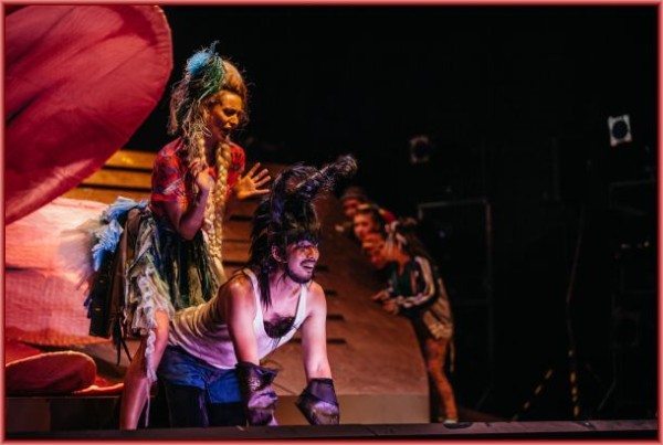 In welcher Welt befindet man sich? Die jungen Leute laufen in heutigen Shirts, Hosen, Röcken herum, die Handwerker erinnern an eine Art Kanalräumerpartie. Oberon könnte einerseits teils als Herodes durchgehen, trägt aber zu undefinierbarem Glitzergewand eine typische, wenn auch ebenfalls glitzernde Diktatorenmütze, während Titana im Look einer Südsee-Insulanerin erscheint. Wenn am Ende Theseus und Hippolyta erscheinen, tun sie es in einer Art exzentrischem Party-Look. Kurz, Loren Elstein schuf für die Kostüme das, was man gut und gern als „Fetzenkarneval“ bezeichnen könnte. Das Geschehen wird damit zwar vage „heutig“, aber doch nie wirklich verortet.