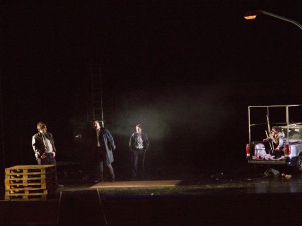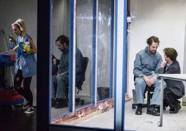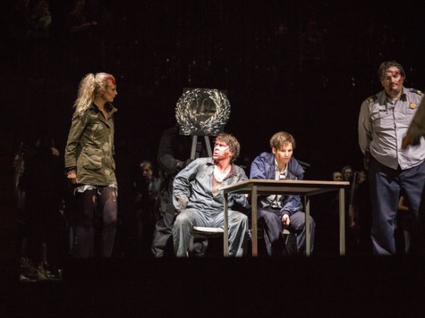 Ungewohnt war schon der Anfang, als anstelle der erwarteten, aber leider dem Rotstift zum Opfer gefallenen Ouvertüre ein gesprochener Text ertönte: Die Schauspieler Claudio Gatzke und Christian Beppo Peters hoben in einem im Hintergrund der von Wilfried Buchholz eingerichteten Bühne aufragenden Glascontainer das Schauspiel „Big Shoot“ des französisch-afrikanischen Autors Koffi Kwahulè mit sehr intensivem Spiel und durchaus aufregend aus der Taufe. In diesem Stück wird eine Verhörsituation in einem diktatorischen Umfeld von Folter und Terror nachgestellt, die mit der Ermordung des Gefangenen endet. Hier wird bereits Knabes Konzept erkennbar: Es geht ihm um die Zurschaustellung von Brutalität und roher Gewalt in einer Diktatur und um die zunehmende Verrohung des Menschen. Das Publikum bezieht er in das Geschehen ein. In der Pause mischen sich einige bedrohlich anmutende, von Gisa Kuhn mit schwarzen Unformen und Stahlhelmen ausgestattete faschistische Soldaten unter die Besucher. Im Laufe des Abends werden Willküropfer der Stalinistischen Terrorherrschaft eingeblendet. Augenscheinlich geht es Knabe um eine Abrechnung mit dem Faschismus Stalins und Hitlers, für die er auch noch andere Stücke heranzieht. So werden dem überraschten Auditorium neben der bereits erwähnten Schauspiel-Uraufführung von „Big Shoot“ eine von der Schauspielerin Juliane Lang zum Großteil recht lautstark vorgetragene Textcollage mit Zitaten aus „Das unsichtbare Komitee“ u. a. sowie das parallel auf der Studiobühne gespielte „Pas Moi“ aus der Feder Samuel Becketts vorgeführt, in dem die Angehörige des Sprechtheaters Gina Haller beeindruckend eine Frau in einer existenziellen Ausnahmesituation spielt.