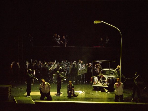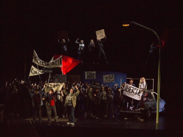Don Fernando sang unsichtbar aus dem Off. Später wurde sein abgeschlagener Kopf hereingetragen. Hier begab sich Knabe auf das Terrain der Französischen Revolution mit ihren auf Fahnen hochgehaltenen Werten Freiheit, Gleichheit und Brüderlichkeit. Und das zu Recht, denn auf diesen Kontext geht die Handlung ja zurück. Der Oper zugrunde liegt eine Erzählung von Jean-Nicolas Bouilly, in der es einer Frau in der Maske eines Mannes gelingt, ihren Ehemann aus einem Gefängnis der Jakobiner zu befreien. Diesen Bezug hat Knabe ganz richtig und klug in seine Deutung integriert. Dem Happy End misstraut er aber. Im Rahmen der aufziehenden Revolution lässt er fast sämtliche beteiligten Personen mit Maschinengewehrfeuer gnadenlos niedermetzeln. Nur Marzelline überlebt und singt zum Schluss an Leonores Leiche Nonos bereits erwähntes Solo „Djamilia Boupachà“ – ein starker Schluss zu einer letztlich nicht sonderlich überzeugenden Inszenierung.