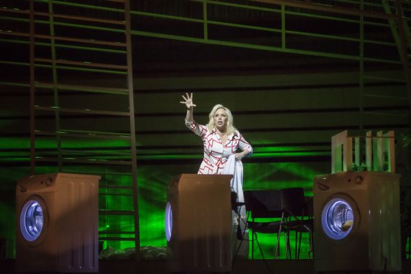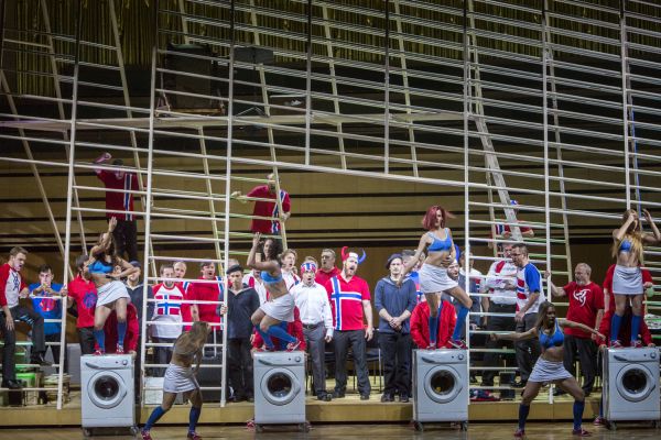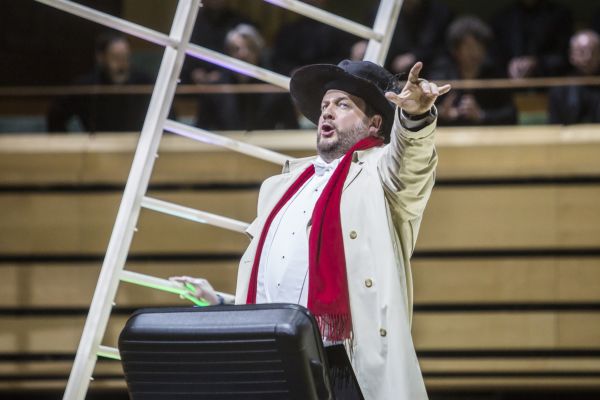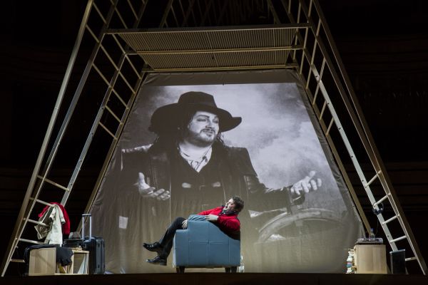 Mit einer exzellenten und stark auf die individuellen Schicksale der Protagonisten abstellenden Personenregie findet die Aktion im Wesentlichen auf einem dreieckigen hellen Holzgerüst statt. Es wirkt wie ein umgedrehter Schiffsbug und suggeriert andererseits die Wanten eines Segelschiffes, auf denen natürlich emsig herumgeklettert wird. Bei Kovalik klammert sich Senta wie besessen an eine alte Schellack-Platte vom „Fliegenden Holländer“ – man erkennt auf dem Cover eine Edition des Chicago Symphony Orchesters in einer Produktion von Decca – und sie wartet offenbar äußerst gespannt auf den Titelhelden. Wenn der nun endlich ankommt, als heutiger Reisender mit kleinem Bord-Trolley, Trenchcoat und rotem Schal und sich gemütlich in einen Ledersessel setzt, macht sich trotz erster Begeisterung bei Senta schließlich Ernüchterung breit. Zudem kann der Holländer am Schluss als Erkennungsstück lediglich den berühmten schwarzen Hut mit weiter Krempe und Feder des Ahasvers aus dem Trolley ziehen. Man konnte diesen Hut bis zum Abwinken schon zuvor auf einem Video des Applauses eines Holländer-Darstellers sehen (Bryn Terfel?). So gibt es auch bei Kovalik keine Erlösung. Stattdessen legt Senta erneut die Platte auf und wartet wohl auf einen anderen Opernhelden, der ihrer „Treue bis zum Tod“ würdiger erscheint…