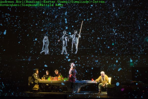 Gemeinsam mit seiner Dramaturgin Eszter Orbán beschreitet der Regisseur aber weiterhin seinen bereits im Rheingold eingeschlagenen Weg, mit seiner an Computer-Animationsfilme angelehnten visuellen Ästhetik ein größeres Publikum anzusprechen. Für die szenische Gestaltung der Bühne sorgte dieses Mal Gergely Z. Zöldy. Mit Siegmunds Auftritt wechselt der Lebensmittelsupermarkt in das Ambiente eines Möbelhauses. Ein geräumiges Doppelbett steht auf der linken Seite der Bühne, in der Mitte ein Tisch bzw eine Anrichte. Hunding tritt dann in Begleitung von zwei Gesellen auf, was natürlich zu seinem Text “Rüst‘ uns Männern das Mahl!“, das ja expressis verbis vom Plural ausgeht, passt. Er wirkt nicht so unsympathisch, wie er zumeist in Inszenierungen gezeigt wird. Er liebt Sieglinde, diese aber wehrt alle seine zärtlichen Annäherungsversuche mehr oder weniger energisch ab. Siegmunds und Sieglindes Erzählungen lässt der Regisseur oberhalb Hundings Behausung pantomimisch darstellen, was viel zum Verständnis eines mit der Vorgeschichte und dem Text vielleicht weniger bewanderten Teiles des Publikums beiträgt.