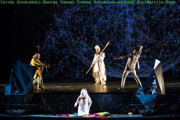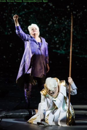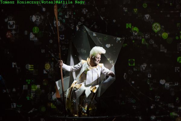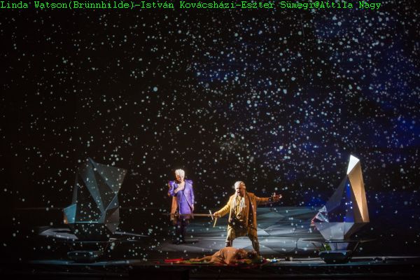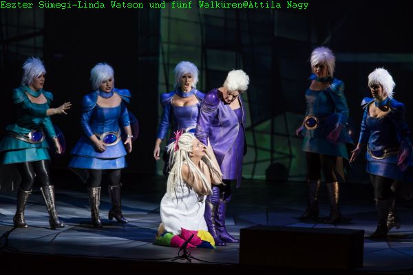Opulente weiße Perücken sind dem Götterpaar Wotan und Fricka beschieden. Die Walküren tragen elegante Office Bekleidung in diversen Blau- und Grüntönen, Brünnhilde hebt sich durch ein Violettes Ensemble von ihnen optisch ab. Für die Premiere leistete sich die Ungarische Staatsoper die führenden Wagnerinterpreten unserer Zeit auf. Tomasz Konieczny überzeugte mich dieses Mal viel stärker als Walkürewotan als im Mai des Vorjahres in Wien. Eine fehlerfreie Diktion und schöne Linienführung kennzeichneten seinen Gesang und auch seine intensive Darstellung eines gefühlvollen, mit sich ringenden Göttervaters, der sich seiner Ohnmacht bewusst ist, und schon einmal voller Verzweiflung vor Brünnhilde niederkniet, waren ein Markenzeichen dieser Inszenierung. Judith Németh hat sowohl Fricka als auch die Brünnhilde in Budapest und in Mannheim 2013 in der Inszenierung von Achim Freyer gesungen. Dieses Mal trat sie wieder in einer ihrer Paraderollen als Fricka und resolute Göttergattin auf, die ihren umtriebigen Göttergemahl schon einmal mit ihrem fordernden Mezzosopran in die Schranken zu weisen verstand. Linda Watson war im Palast der Künste bereits als Brünnhilde an allen drei Tagen des Ringes zu bewundern. Sie hat noch immer eine bemerkenswerte Höhe und nur gelegentlich Ermüdungserscheinungen in der Mittellage, die die routinierte Sängerin aber durch ihre Technik und Gestaltungskraft aufwiegen konnte. Der Regisseur verlangte von ihr auch eine Rücknahme pathetischer Gestik zugunsten einer mehr verhaltenen, intimeren Darstellung des Götterkindes, das Anteil nimmt an der Liebe zweier Menschenkinder. Diese beiden, Sieglinde und Siegmund, wurden durch die herausragenden ungarischen Sänger Eszter Sümegi und István Kovácsházi interpretiert. Beide Sänger hätten es schon längst verdient, wieder an die Wiener Staatsoper eingeladen zu werden. Zumindest Eszter Sümegi hat hier ja schon eine vielversprechende Leistung als Tosca geliefert. Die sympathische Sängerin scheint momentan auf dem Höhepunkt ihrer Karriere zu stehen. Die Stimme ist in allen Lagen ausgeglichen und kräftig und von einer derart unverwechselbaren Färbung gezeichnet, das man sie sofort heraushört. István Kovácsházi gelangen zwei beeindruckende Wälse-Rufe, ersteren hielt er etwa 8 Sekunden, den zweiten sogar ganze 11 Sekunden (wenn ich richtig gezählt hatte) an. Natürlich ist so ein Längenvergleich bei den Wälse-Rufen unangepasst, und dennoch ertappt man sich selber immer wieder dabei, insgeheim die Sekunden zu zählen…